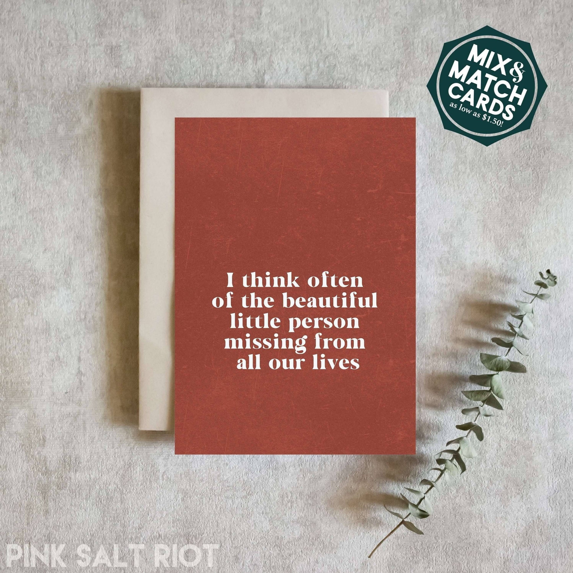 One of the greatest pains of miscarriage, stillbirth, and child loss is the feeling that the world goes on unchanged and your child's absence is unnoticed by everyone but you and perhaps your immediate family. This loss anniversary card is a meaningful way to let someone know that their child is not forgotten, and that their grief is still shared.