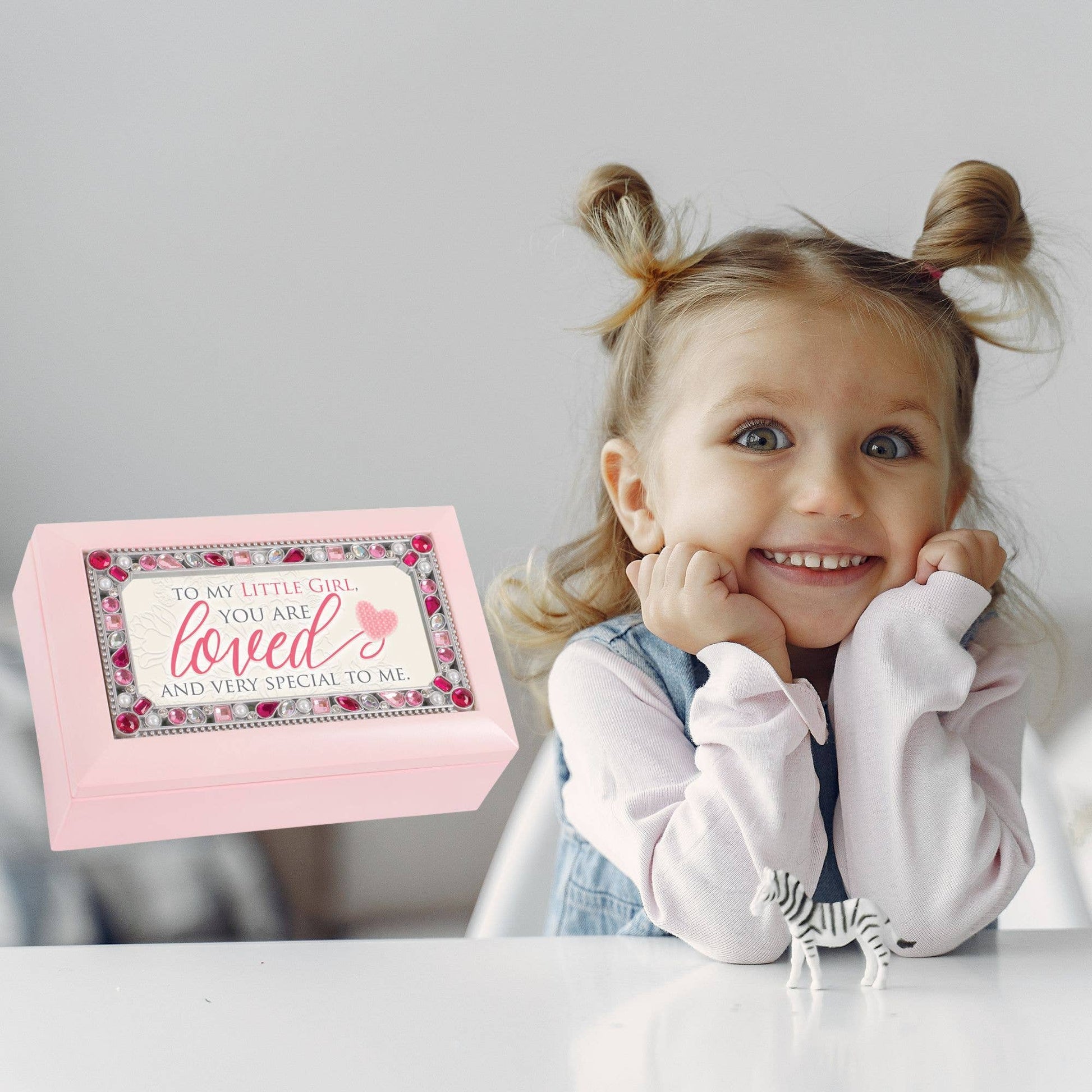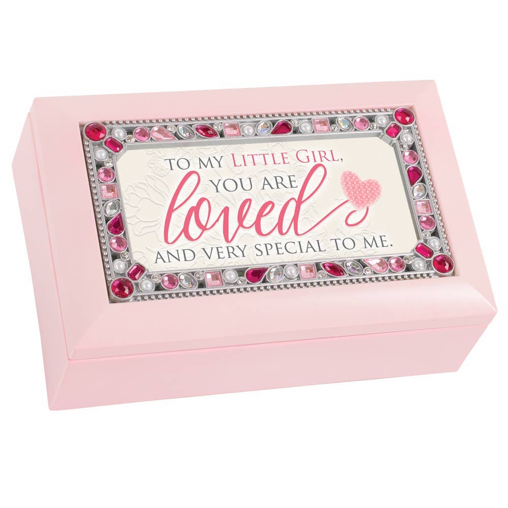Pink Jeweled Petite Music Box with pink and clear colored jewel beads adorn the frame lid; Glossy pink finish. Jewelry box measures approximately 6 x 4 x 2.5 inches; Replace artwork with 3 x 5 inch personal photo. Black velvet lined interior cushions your precious treasures; Decorative bun feet are padded to protect table top and shelf surfaces. Wind-up mechanism engages music. Song: YOU ARE MY SUNSHINE