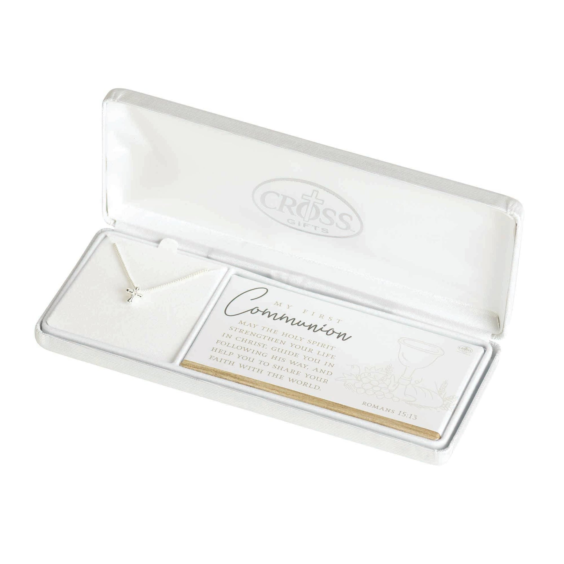 Romans 15:13 First Communion Silver Plated Petal Cross Necklace - Silver Plated Petal Cross is 3/8 inches long and hangs from a 16 inch Silver Plated Chain. Packed in a white hinged box with insert that reads: My First Communion – May the Holy Spirit strengthen your life in Christ, guide you in following His way, and help you to share your faith with the world.