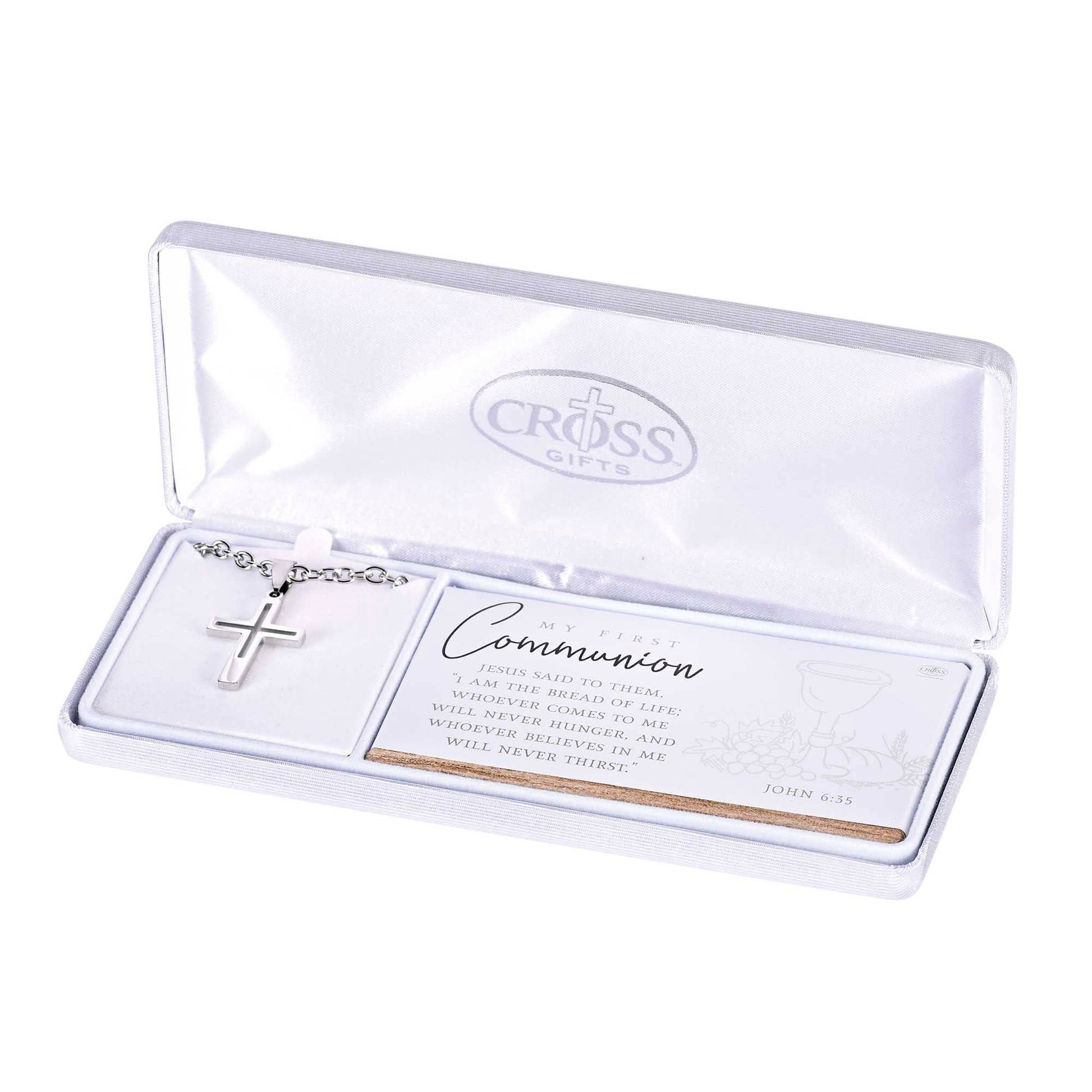 Necklace is a Stainless Steel Box Cross with cutout Cross is 1 inch long and hangs from an 18 inch Stainless Steel Chain. Packed in a white hinged box with insert that reads: My First Communion; with John 6:35: Jesus said to them, I am the Bread of Life: whoever comes to Me will never hunger, and whoever believes in me will never thirst.
