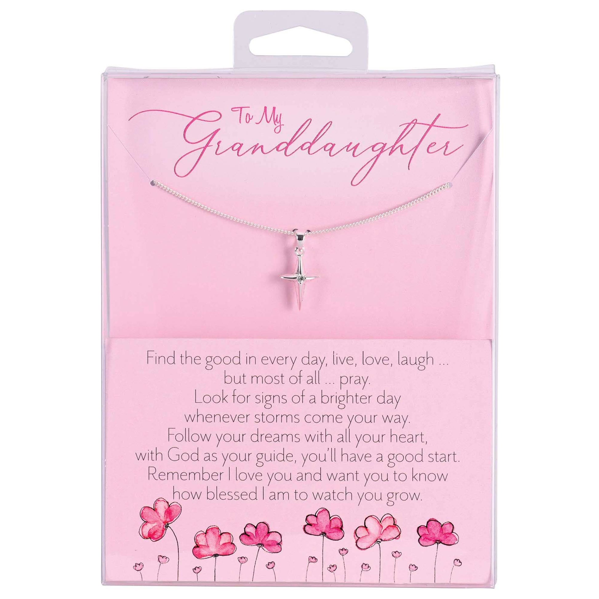 To My Granddaughter Star Cross With Crystal Silver Plated Pendant On An 18 Inch Silver Plated Cable Chain Measures 5/8 x 1/2 And Is Meant For An Adult Grandchild. Necklace Comes Packed In A Clear Acetate Box Measuring 4.5 x .625 x 8.75 Inches With Insert That Reads: Find The Good In Every Day, Live, Love, Laugh - But Most Of All - Pray. Look For Signs Of A Brighter Day Whenever Storms Come Your Way. Follow Your Dreams With All Your Heart, With God As Your Guide, You Will Have A Good Start. Remember I Love You And Want You To Know How Blessed I Am To Watch You Grow. Verse By Alda Maria Copyright Dicksons. Spring Ring Clasp.
