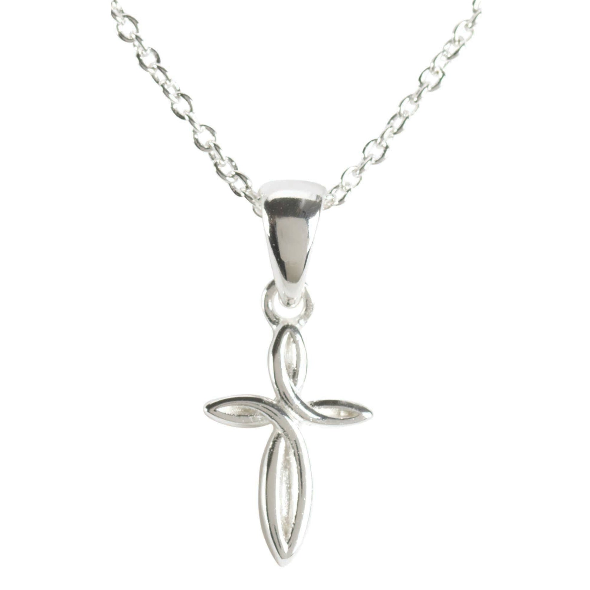Silver Plated Petal Cross Necklace measures 1 1/16 inch and is on an 18 inch chain. Packed in white deluxe box.