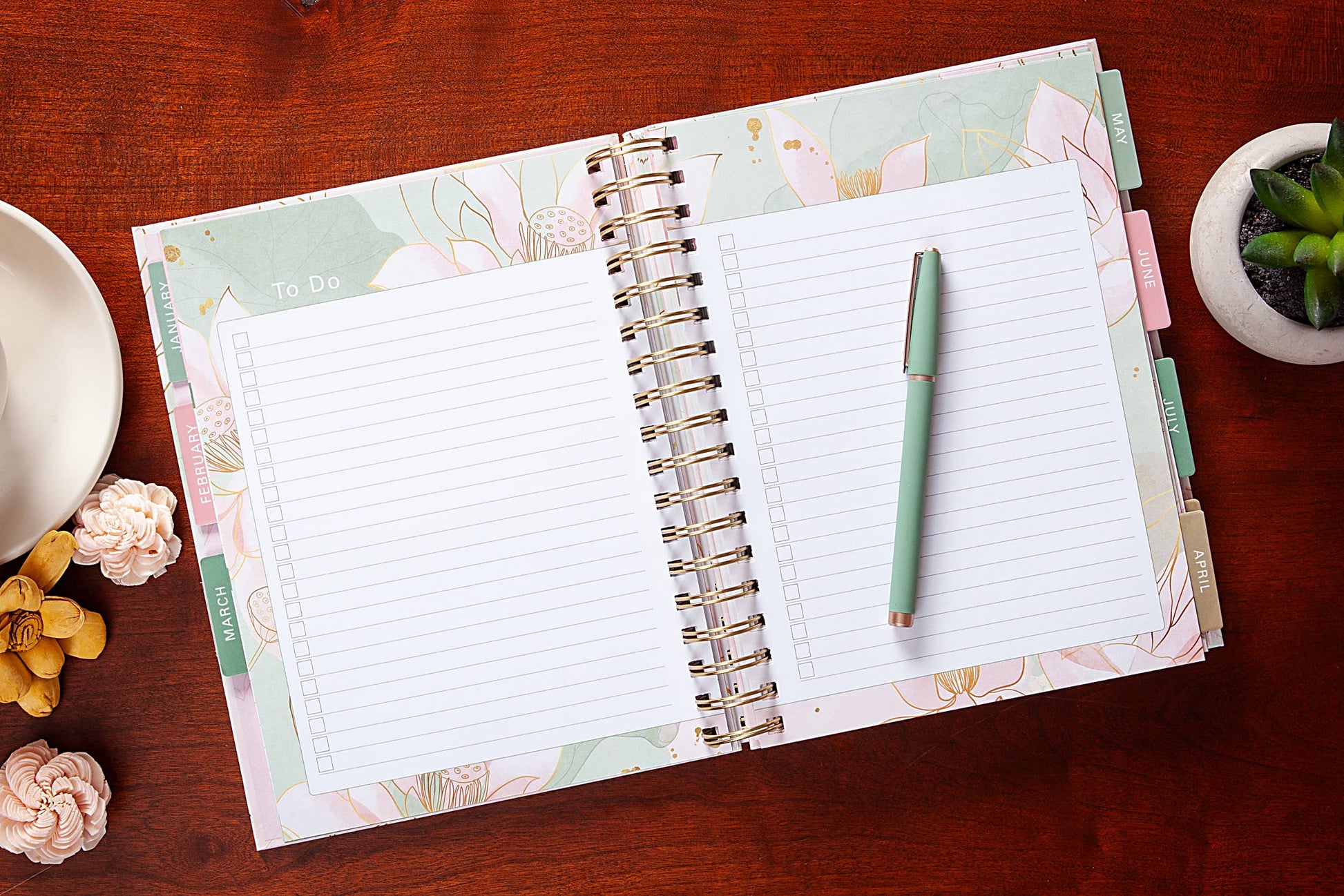 • Spiral bound planner creates durability and allows pages to lay flat when open.