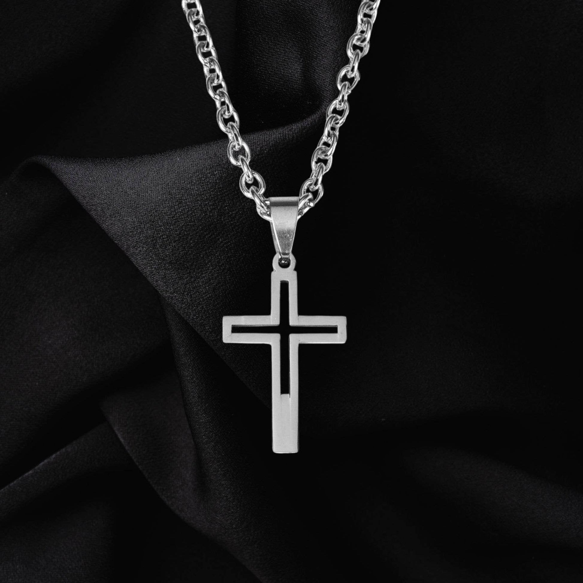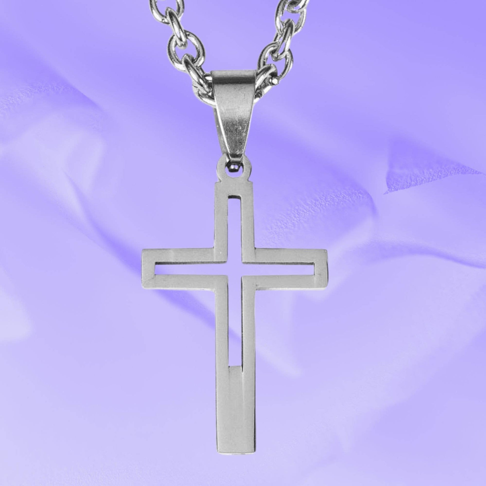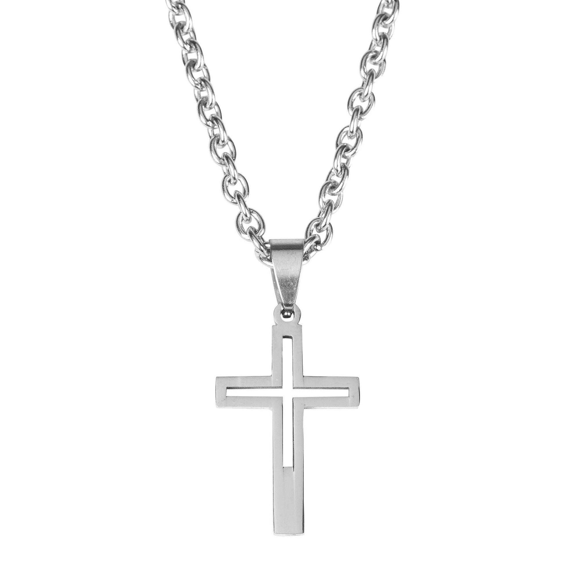 Stainless steel cutout box cross on 18" chain necklace in white gift box bold box style cross, with cutout center, makes a distinctive statement. Cross and 18" chain are both stainless steel. This necklace makes a great gift for a boy, or a man or woman who prefers a bolder pendant with the 18" chain length. Cross length is 1 1/8". Comes in white fabric covered gift box with hinged lid.