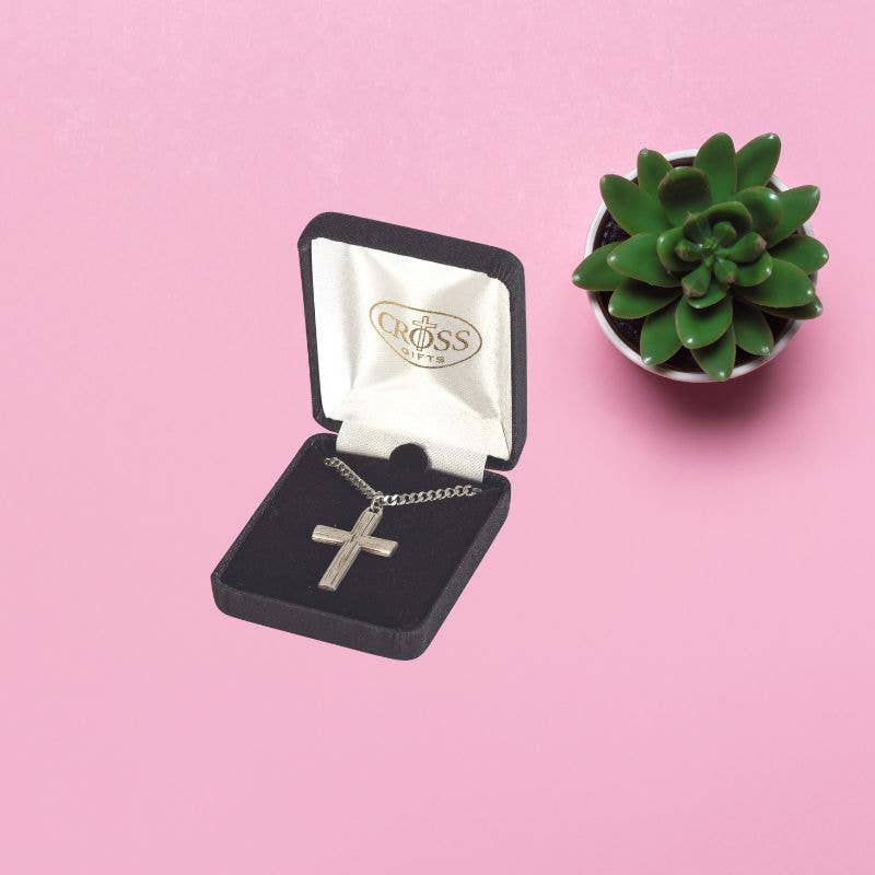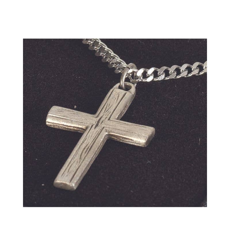 Pewter Grain Box Cross Necklace, 1 1/4" pendant on 24" stainless steel chain. Comes in black fabric covered deluxe gift box.