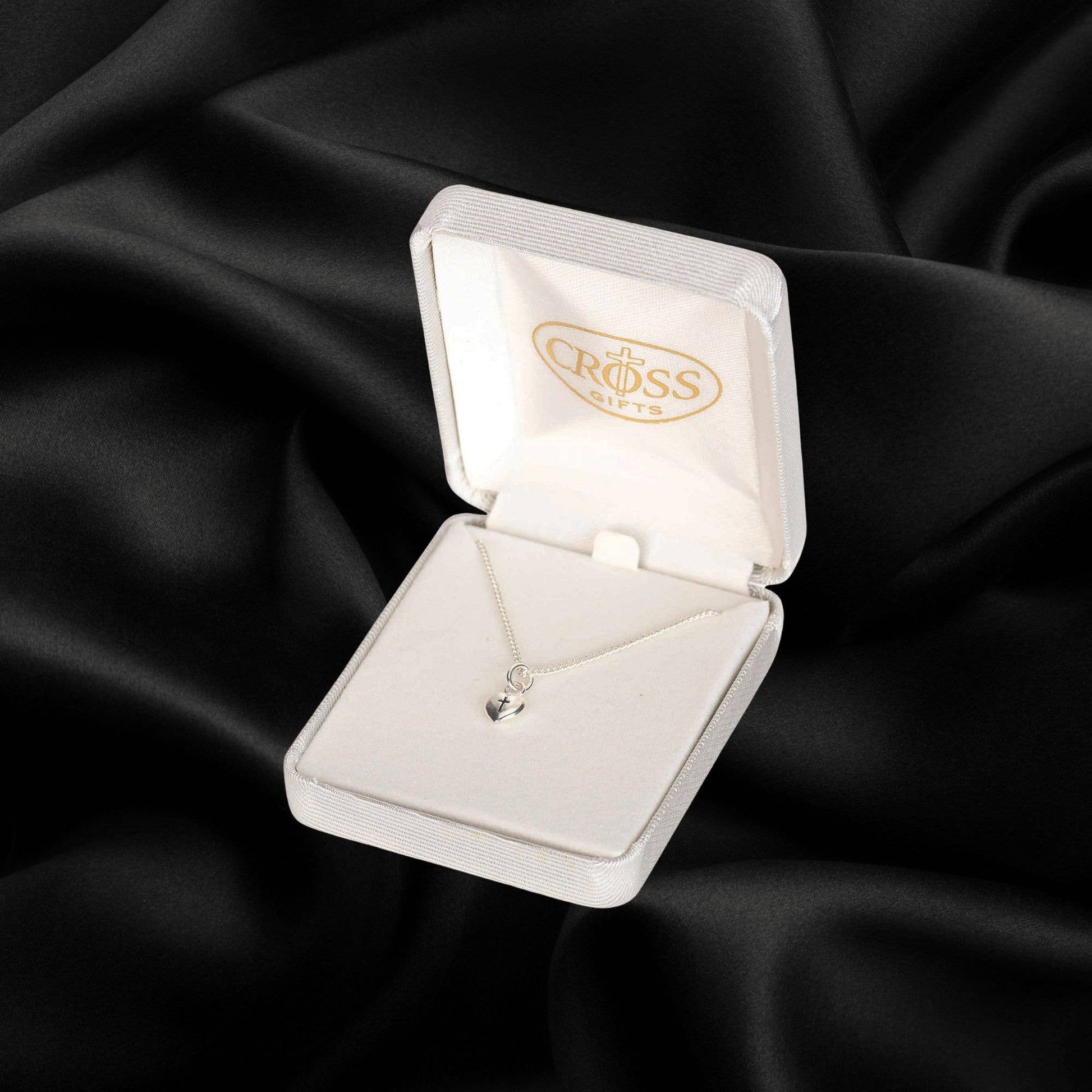 Mini puff heart with engraved cross on 13" chain necklace in white gift box dainty puff style heart is engraved with a simple cross. Makes a wonderful gift for a baby or young girl, or for older girls or women who prefer a shorter chain and small pendant. Silver plated heart is 1/4" long; silver plated chain is 13". Comes in white fabric covered gift box with hinged lid.