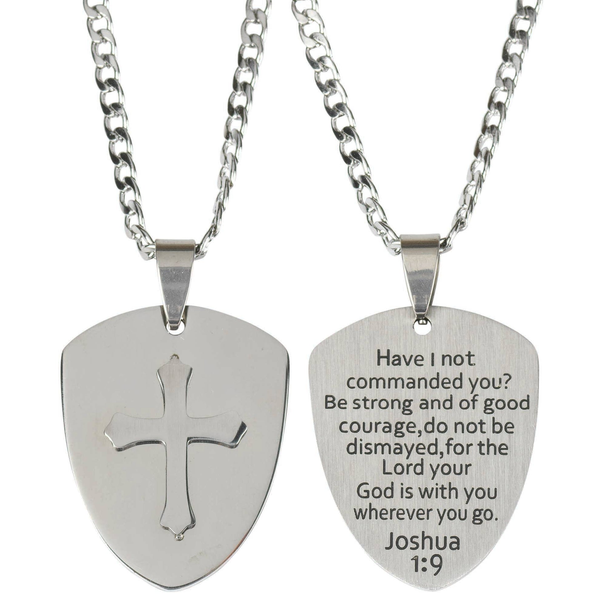 Men's stainless steel shield with cross and joshua 1:9 necklace shield shape pendant has a raised budded cross on front and the words of joshua 1:9 engraved on back. "Have I not commanded you? Be strong and of good courage; do not be dismayed, for the lord your god is with you wherever you go." stainless steel pendant is 1 1/4"L x 1"W; stainless steel chain is 24". Necklace comes on attractive header card with verse on back.