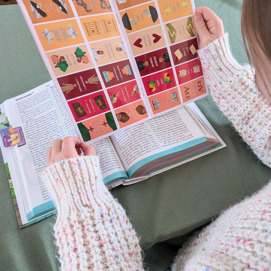 The Old and New Testament Bible Tabs will arrive in a neat little book! Inside, you will find a foldable sticker for each book of the Bible. Each sticker features a symbol that represents that book of the Bible in a meaningful way.