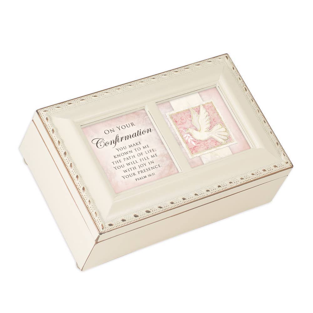 Hinged lid designed with double window frame; embossed rope trim details. Jewelry box measures approximately 6 x 4 x 2.5 inches; Replace artwork with 3 x 5 inch personal photo. Black velvet lined interior cushions your precious treasures; Decorative bun feet are padded to protect table top and shelf surfaces. Traditional wind-up mechanism engages music. Plays: AVE MARIA