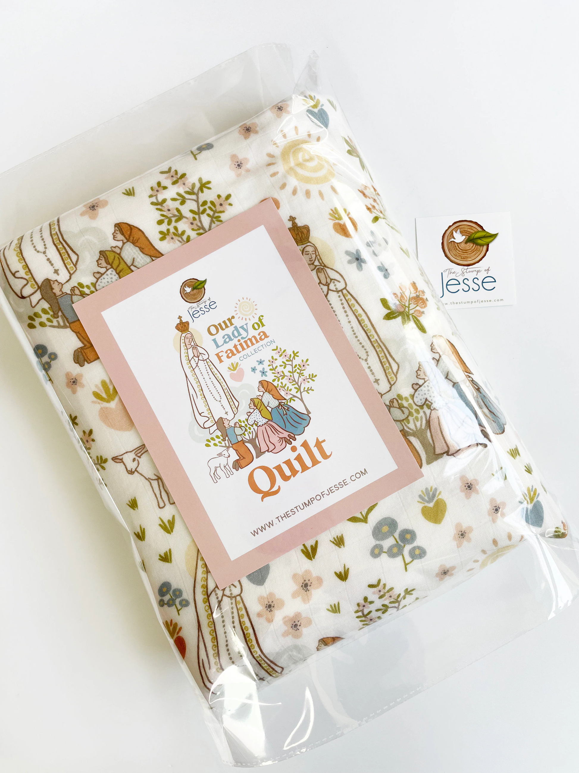 Our Lady of Fatima Muslin Deluxe Quilt 8 layers 30% Cotton and 70% bamboo. Double-sided: Pattern of Our Lady of Fatima on one side and stripes on the back Size: 47"x47" Great for crib, car seat, stroller, etc.. Machine Wash in Cold water Tumble dry low Keep away from Velcro