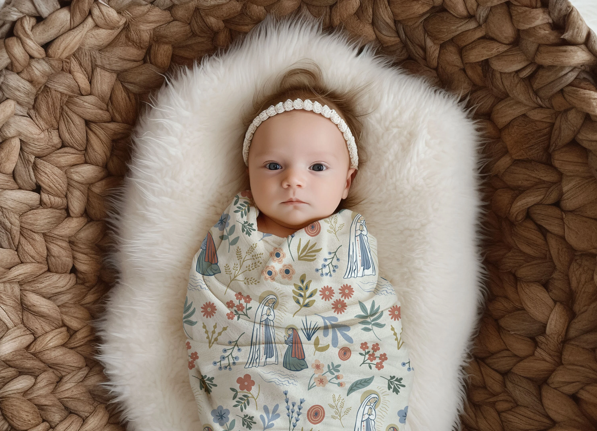 Our Lady of Lourdes and St. Bernadette Muslin Deluxe Swaddles