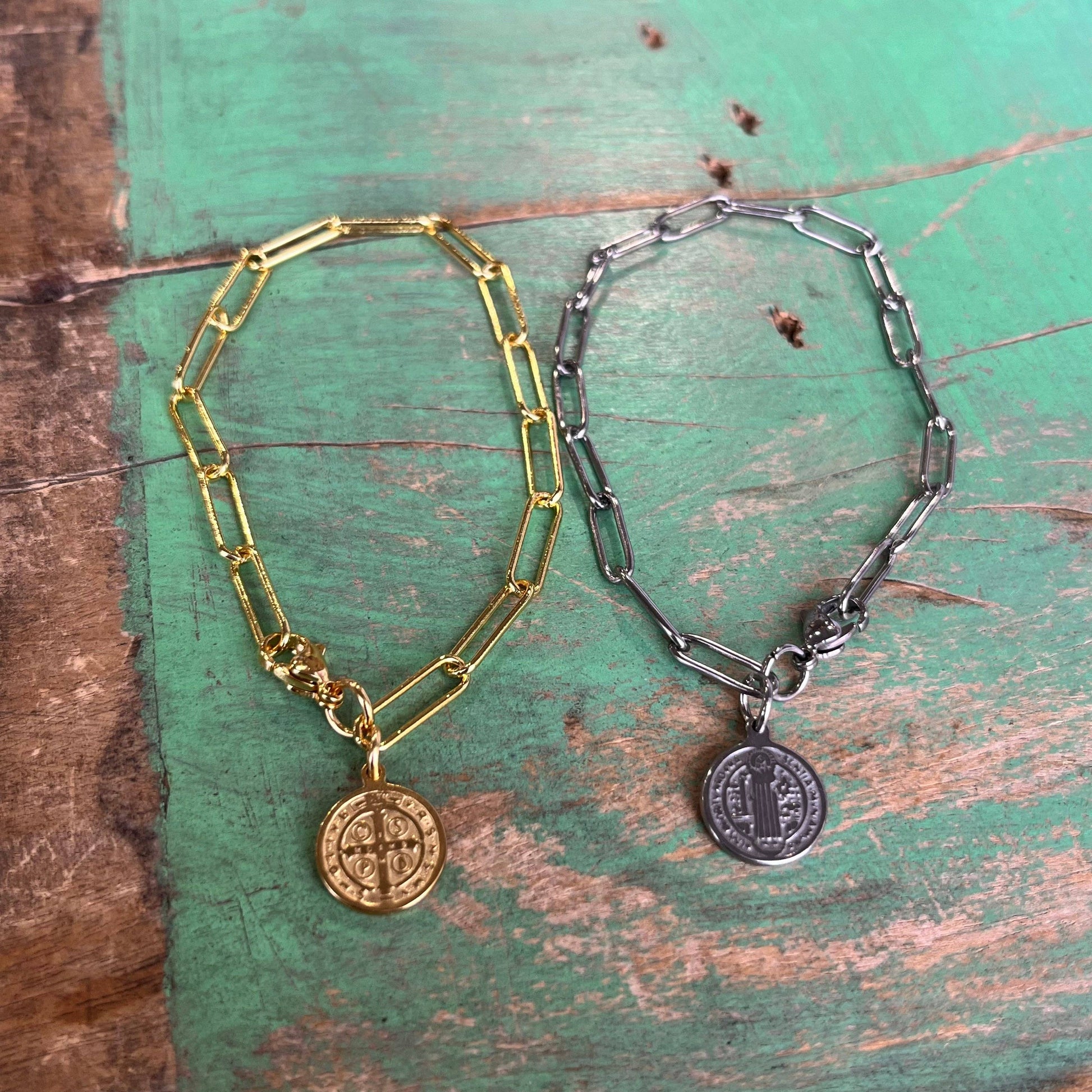 Stainless steel St. Benedict bracelets in gold and silver! This paper clip style bracelet is lightweight and very trendy! 7.5” average size or it can be clipped to be made smaller.