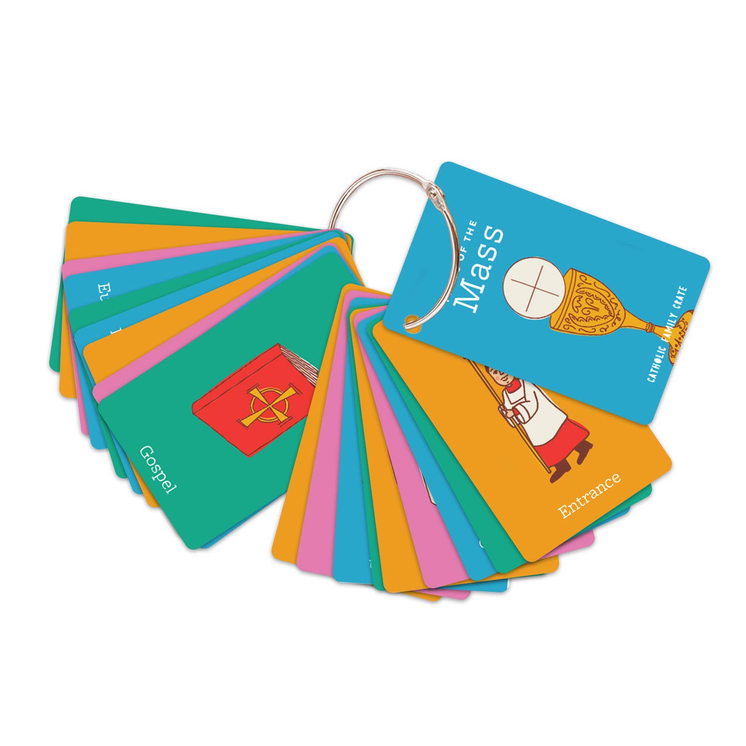 This pocket-sized guide is perfect for teaching your pint-sized saints about the Order of the Mass. The Mass Parts Cards come on a ring and outline the four parts of the mass, explaining what happens in each. Color-coordinated cards complete with illustrations and explanations allow children to familiarize themselves with the order and importance of each piece of the mass. Armed with this knowledge, our saints in training are empowered to participate more fully and confidently in the Holy Mass. All 29 cards are held on a 2″ metal ring for safe-keeping!