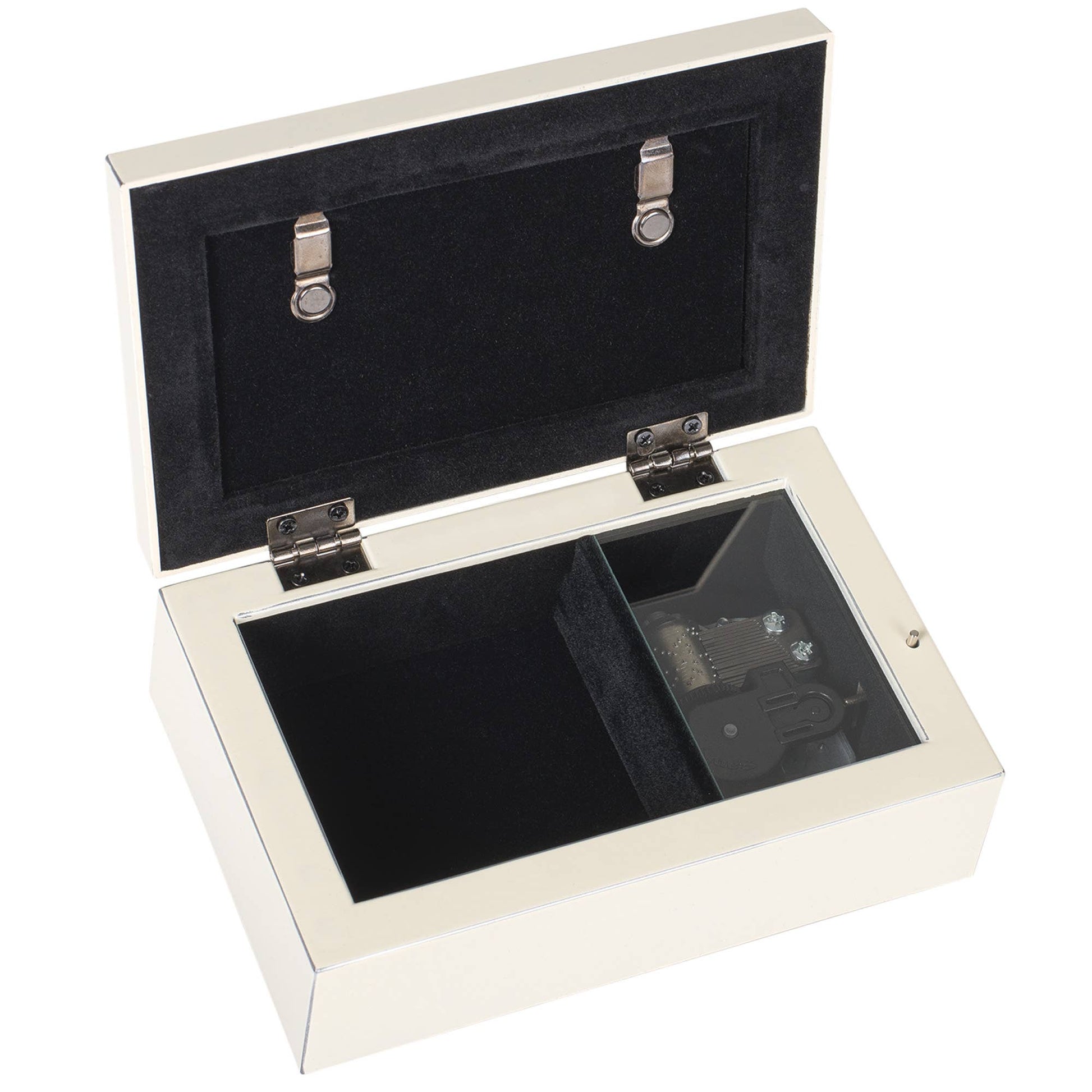 Embossed Rosette Details With White Finish. Jewelry Box Measures Approximately 6 x 4 x 2.5 Inches; Can Replace Confirmation Artwork With 3 x 5 Inch Personal Photo. Black Velvet Lined Interior Cushions With Decorative Bun Feet Are Padded To Protect Table Top And Shelf Surfaces. Traditional Wind-Up Mechanism Engages Music. Plays: Jesus Loves Me