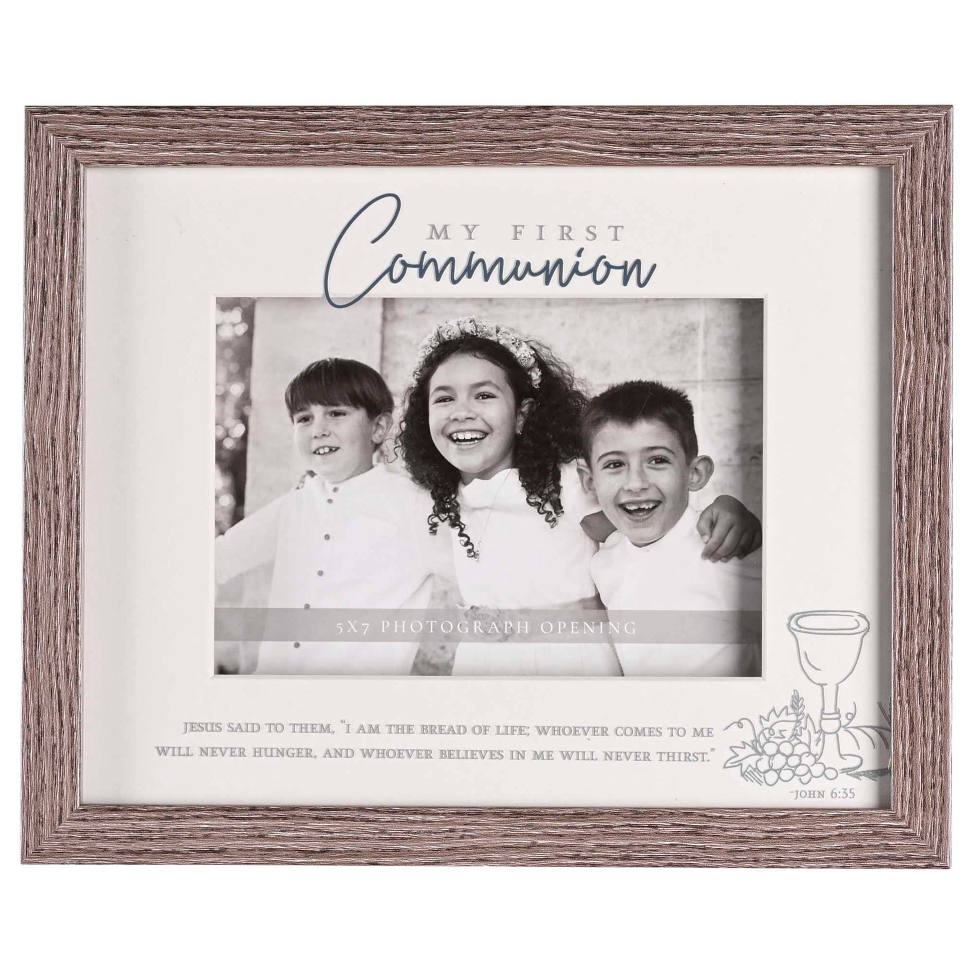 Shadow Box Style Photo Frame Features Text: My First Communion; Along With John 6:35: Jesus Said To Them, I Am The Bread Of Life; Whoever Comes To Me Will Never Hunger, And Whoever Believes In Me Will Never Thirst. Text And A Watermarked Chalice Are Printed On The Underside Of Glass That Sits 3/4 Above A White Matboard For Your 7x5 Photo. Wood Grain Frame Is MDF Wood. Window Size Is 10 x 8; Outer Frame Size Is 11 x 9. Removable Back Includes Pull-Out Easel Plus Hanging Hooks For Either Tabletop Or Wall Display.