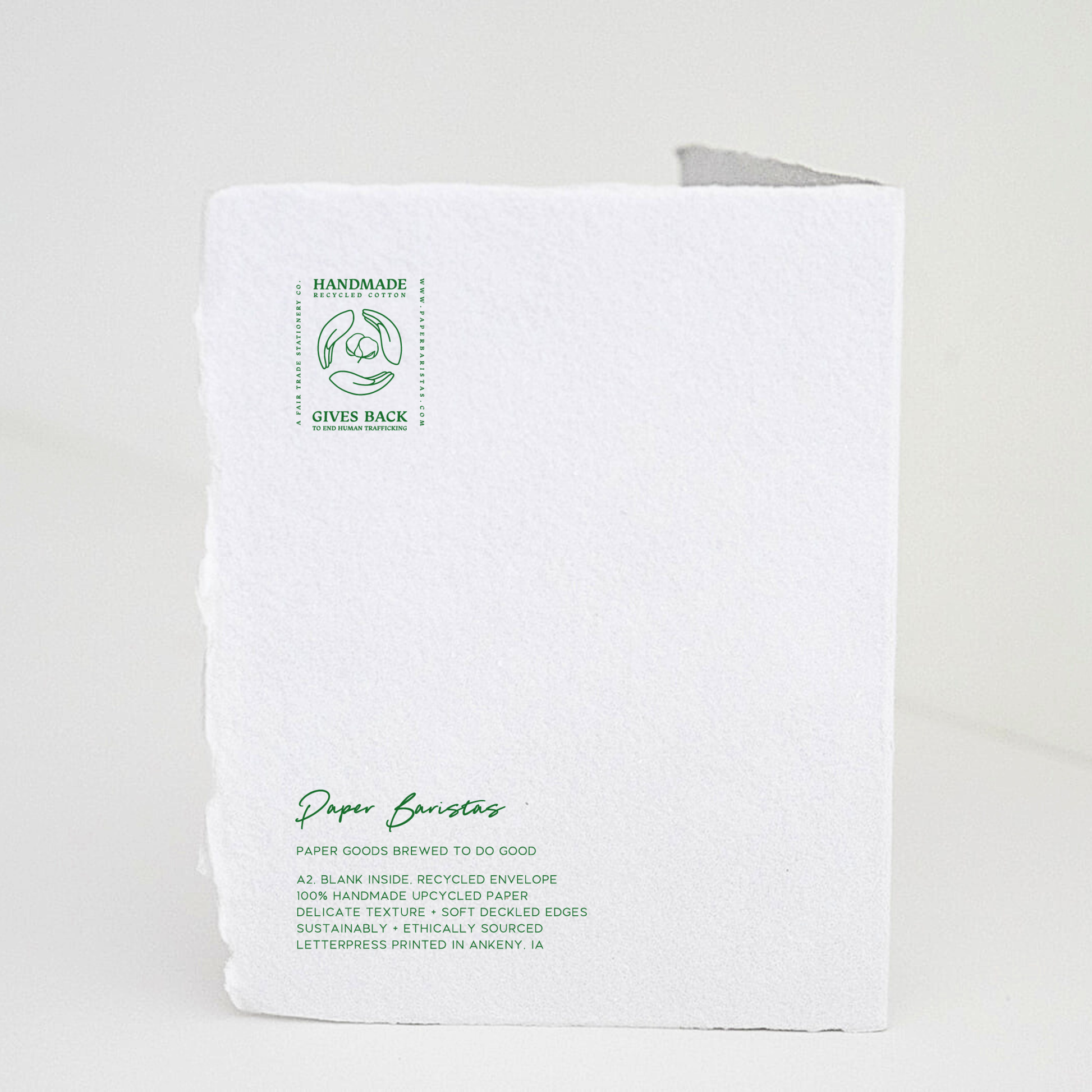 Our handmade deckled edge paper collection is letterpress printed in-house late at night with lots of coffee. This card is meant to be treasured for years to come. Handmade paper beautiful enough to frame and helps us ensure there was no slave labor in our supply chain. 10% goes to fight for human rights in the supply chain.
