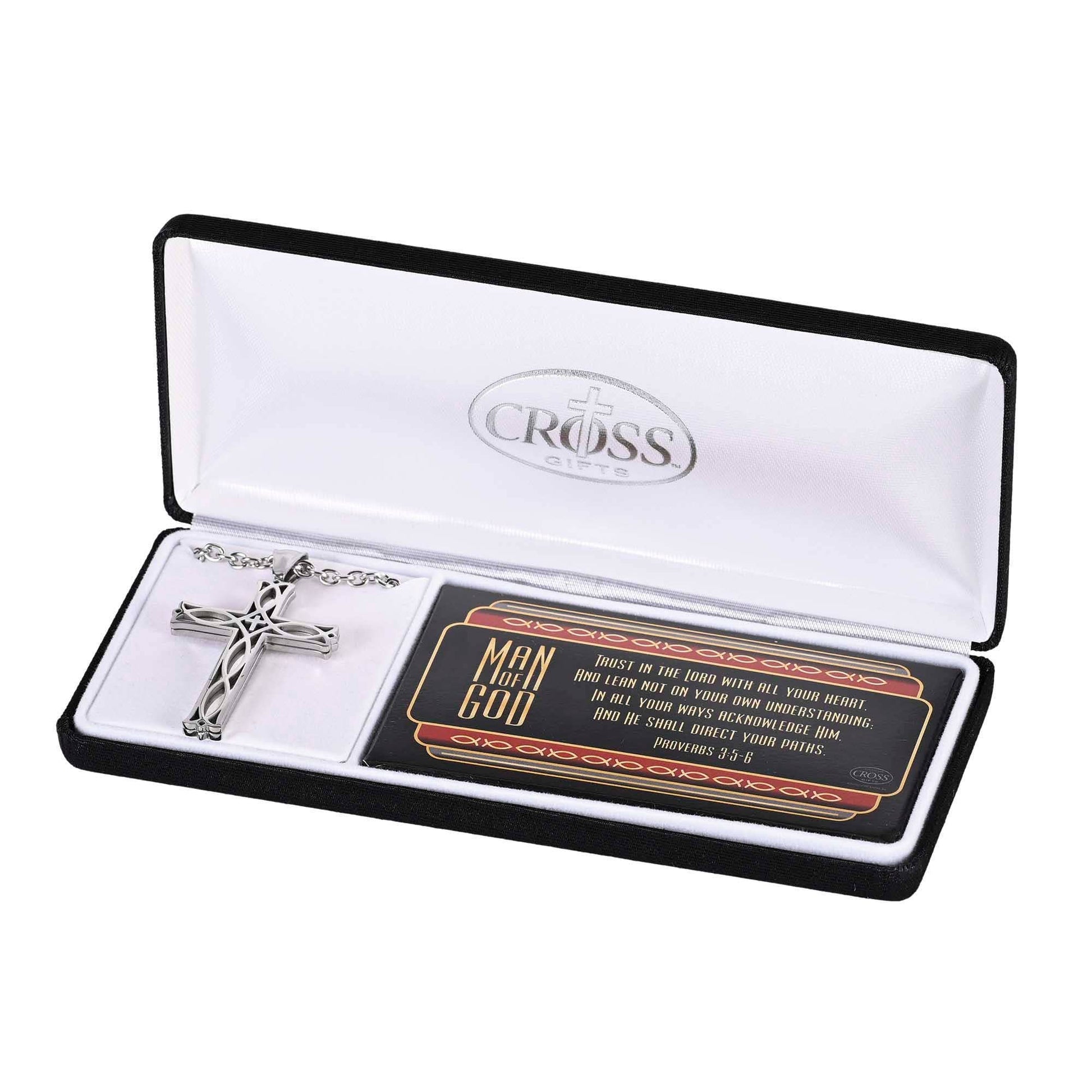 Man Of God Stainless Steel Cross With Fish Is Budded And Measures 2L x 1-1/4W. Cross Is On A 24in Chain And Comes Packed In A Black Gift Box With Insert That Reads: Man Of God - Trust In The Lord With All Your Heart, And Lean Not On Your Own Understanding; In All Your Ways Acknowledge Him, And He Shall Direct Your Paths. Proverbs 3:5-6