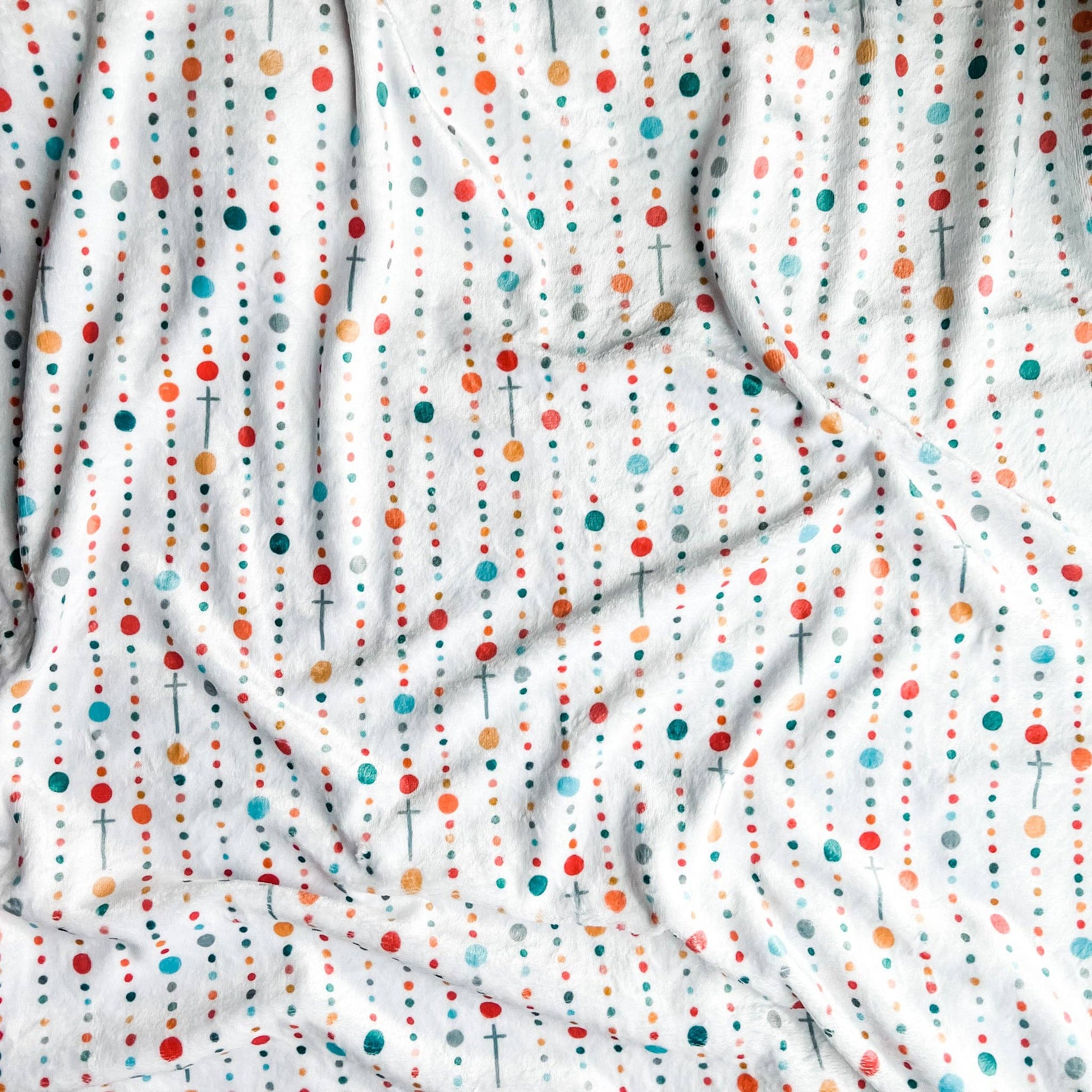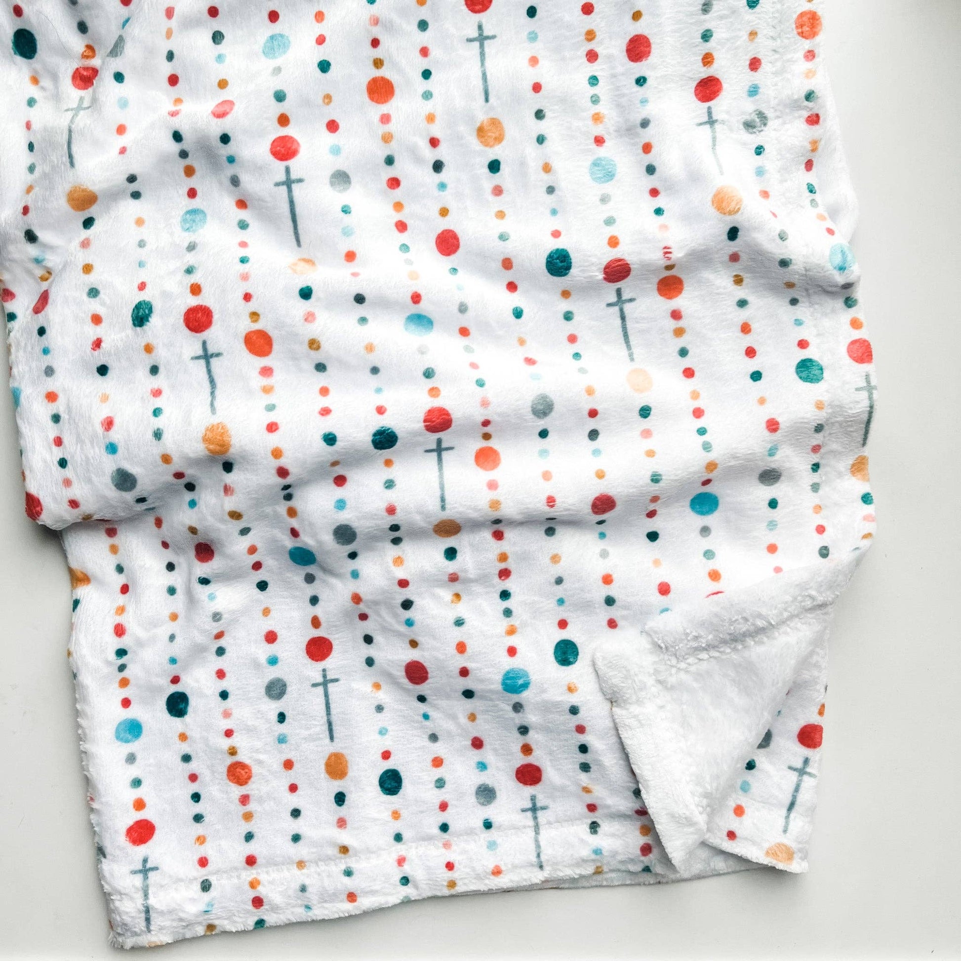 Blanket has Rosary design to wrap up in prayer! Size: 30” x 40” Solid White Backside Material: Ultra-Smooth Micro-Mink Polyester Care: Machine Wash Cold, Tumble Dry. Please keep in mind, we strive for accurate photography - however, coloring may vary from screen to screen.