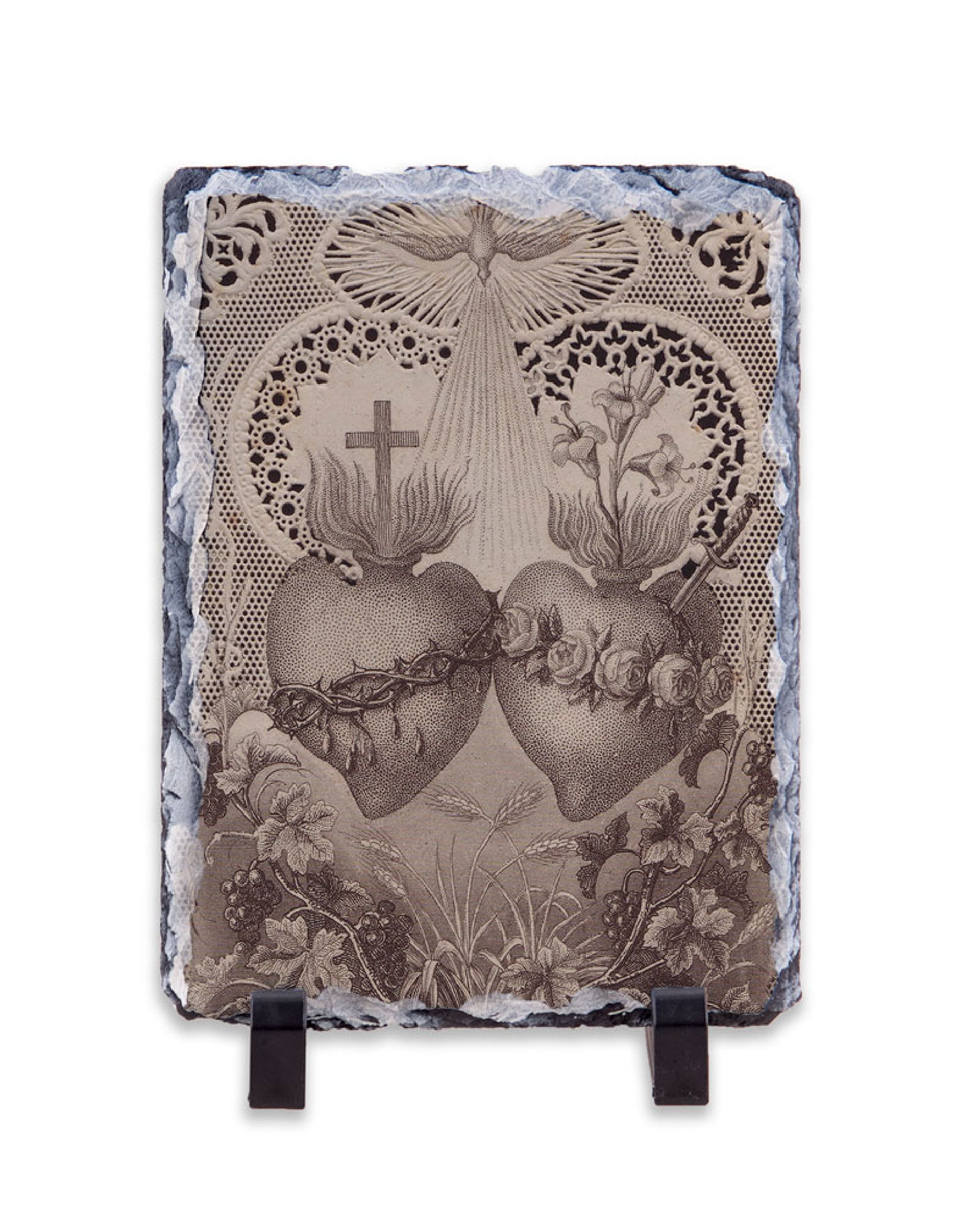 This Sacred and Immaculate Hearts French Lithograph vertical slate tile comes with two black easel "feet" to allow the tile to stand upright on a desk, shelf, or table. No two slate tiles are 100% alike.