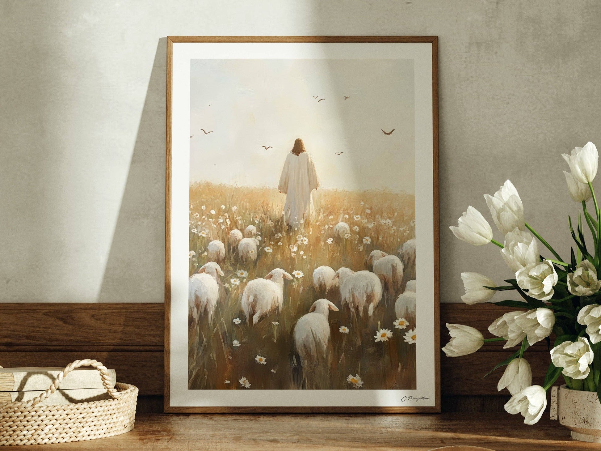 Utilizing the highest quality Giclee printing process with acid-free archival inks on museum-grade fine art paper, these prints capture the essence of each painting with stunning clarity and color depth. I handmake and sign each piece, reflecting my commitment to bring you timeless and affordable Christ-centered art. Inspired by Psalm 100:1-5, "Safe in His Care #3" symbolizes the loving care and guidance of our Savior, who watches over us with perfect compassion.