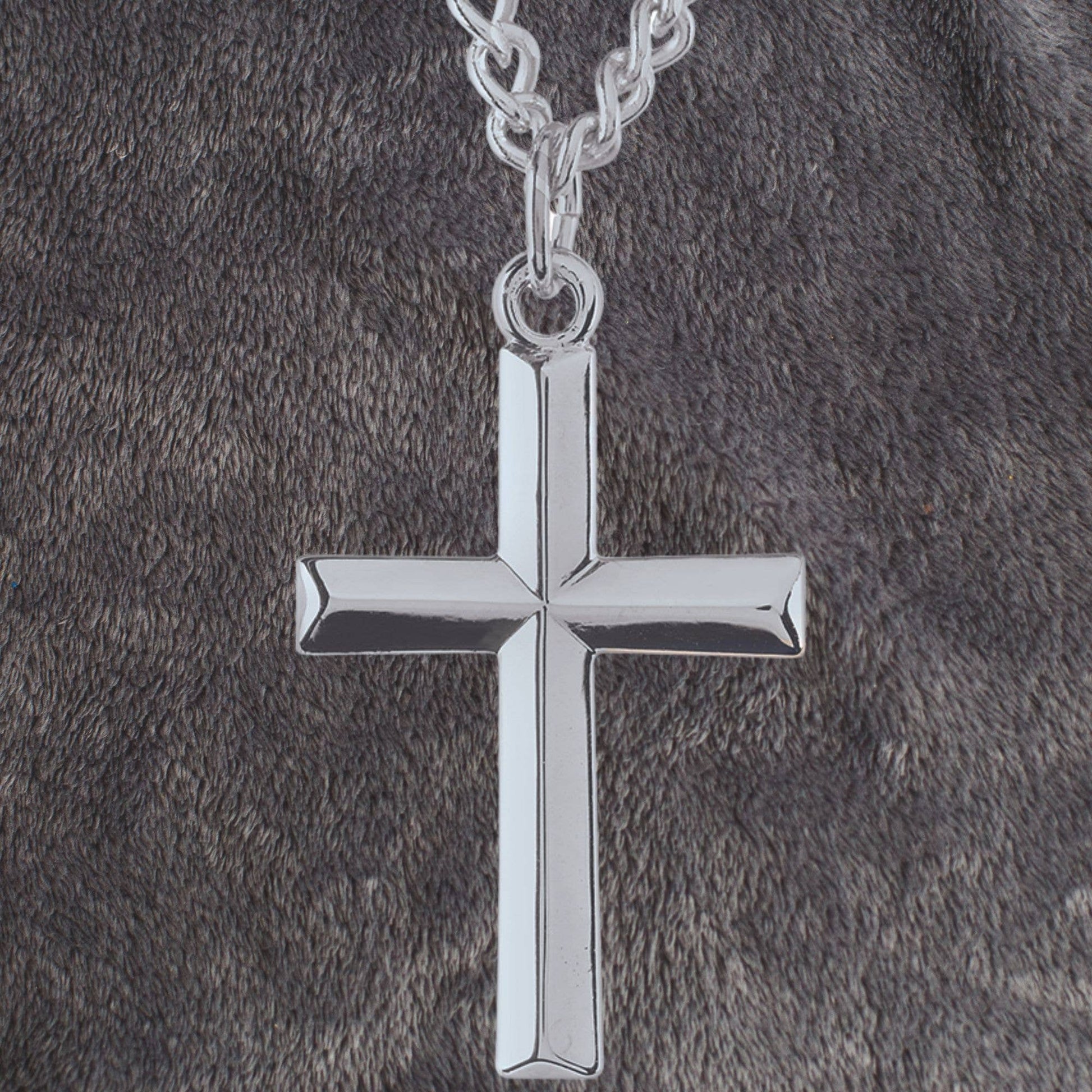 Handsome cross necklace, with its plain beveled design, can be a gift for either men or ladies. Pendant, which is silver plated, is 1 1/8" long, and the silver plated cable chain is 24" long. In a deluxe gift box.