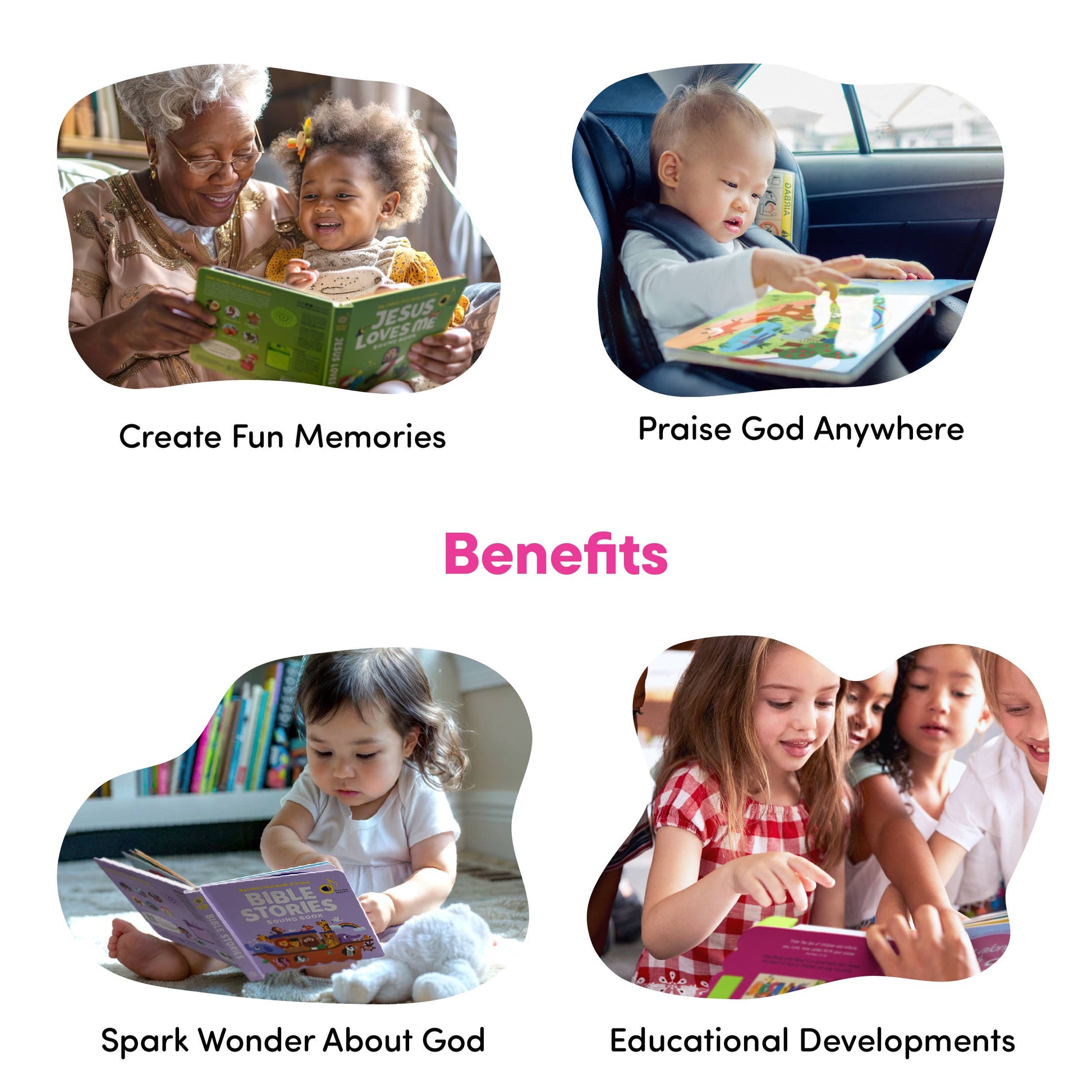 ✓ Six kids' favorite bible songs + colorful illustrations, and Interactive song buttons with volume control switch (Off-Low-High)