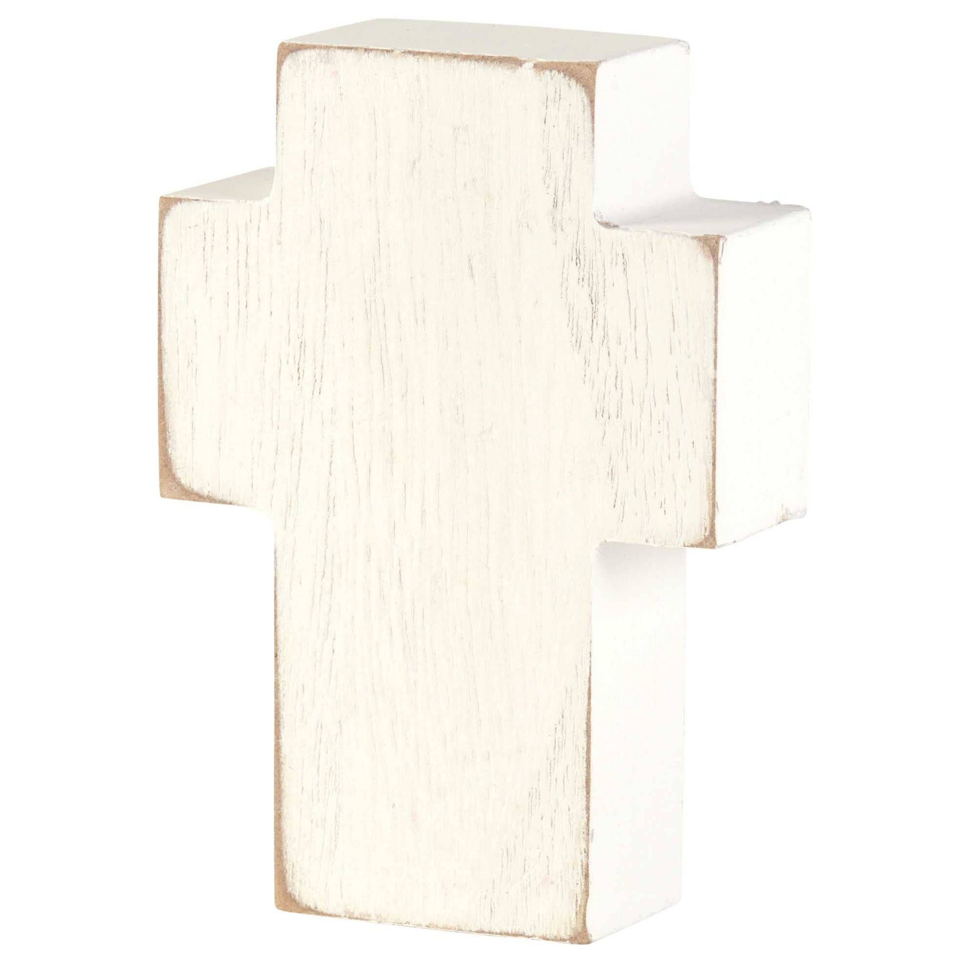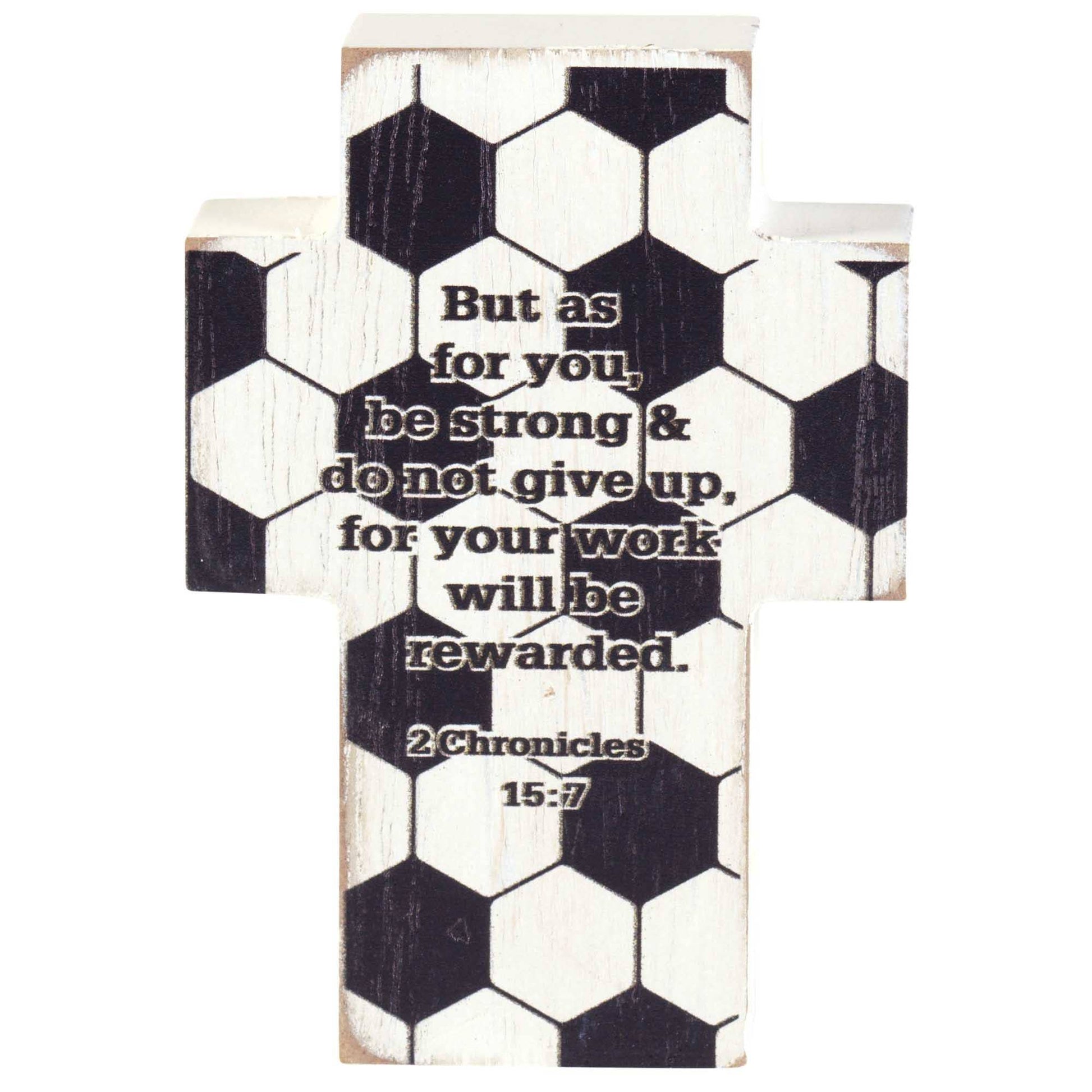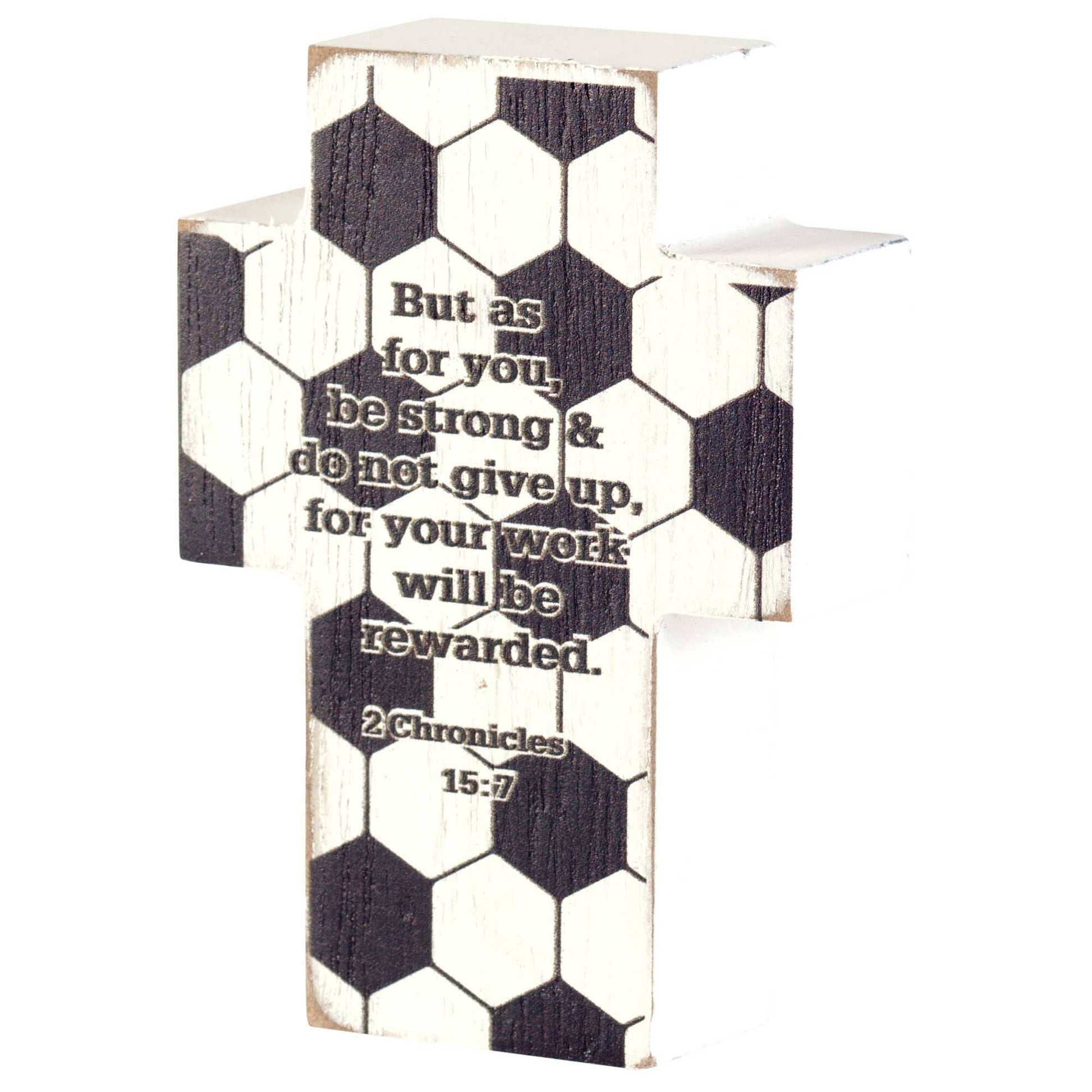 Soccer ball design and the words of 2 Chronicles 15:7 are featured on this block style tabletop cross. Ideal for anyone who plays or just loves this great sport. Verse: "But as for you, be strong and do not give up, for your work will be rewarded." Sides and back have white wash finish. Cross is MDF wood; size is 2 3/4" x 4" x 1".