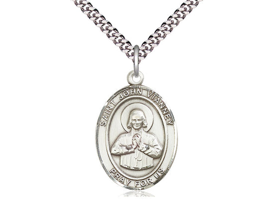 Sterling Silver St John Vianney Pendant on a 24 inch Light Rhodium Heavy Curb Chain.