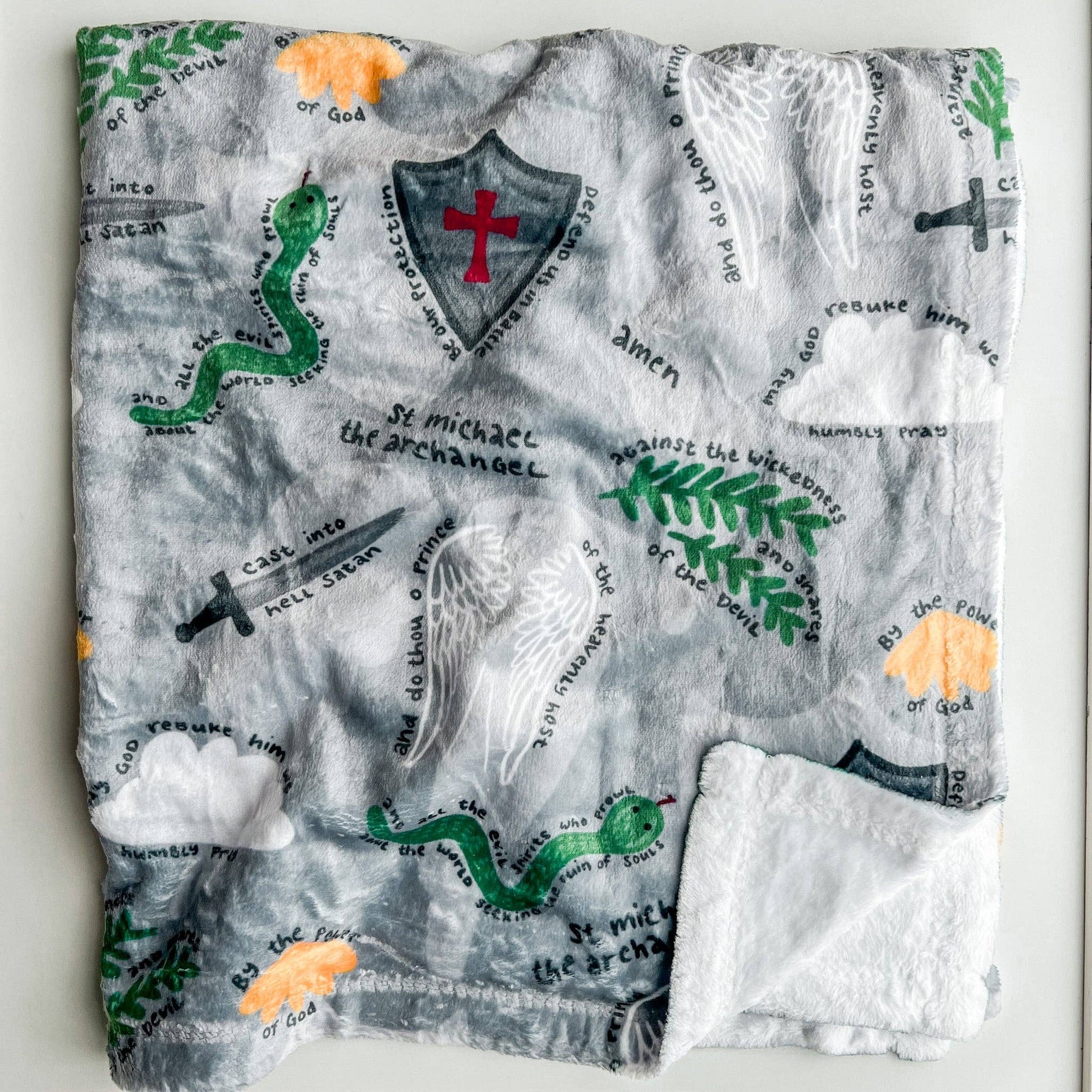 Blanket has original St Michael Design to wrap up with love! Size: 30” x 40” Solid White Backside Material: Ultra-Smooth Micro-Mink Polyester Care: Machine Wash Cold, Tumble Dry. Please keep in mind, we strive for accurate photography - however, coloring may vary from screen to screen.