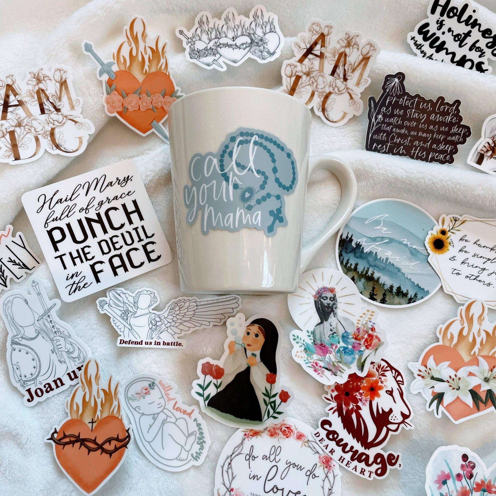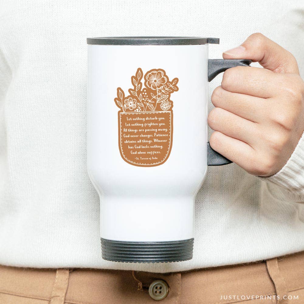 A beautiful prayer by St. Teresa of Avila - in sticker form! Put this durable, vinyl sticker somewhere you'll see it daily and be reminded to trust in God's plans for your life. "Let nothing disturb you, Let nothing frighten you, All things are passing away: God never changes. Patience obtains all things. Whoever has God lacks nothing; God alone suffices."
