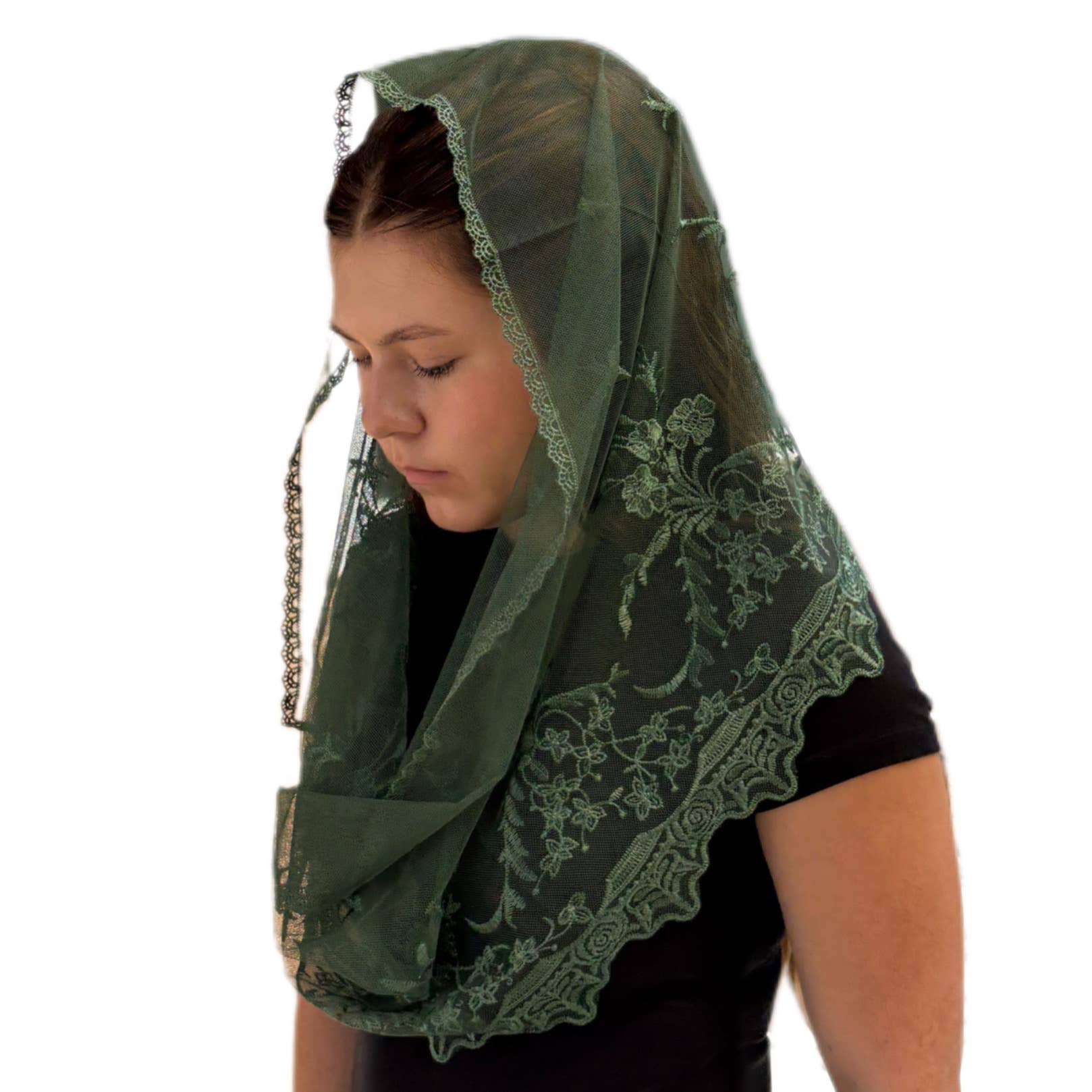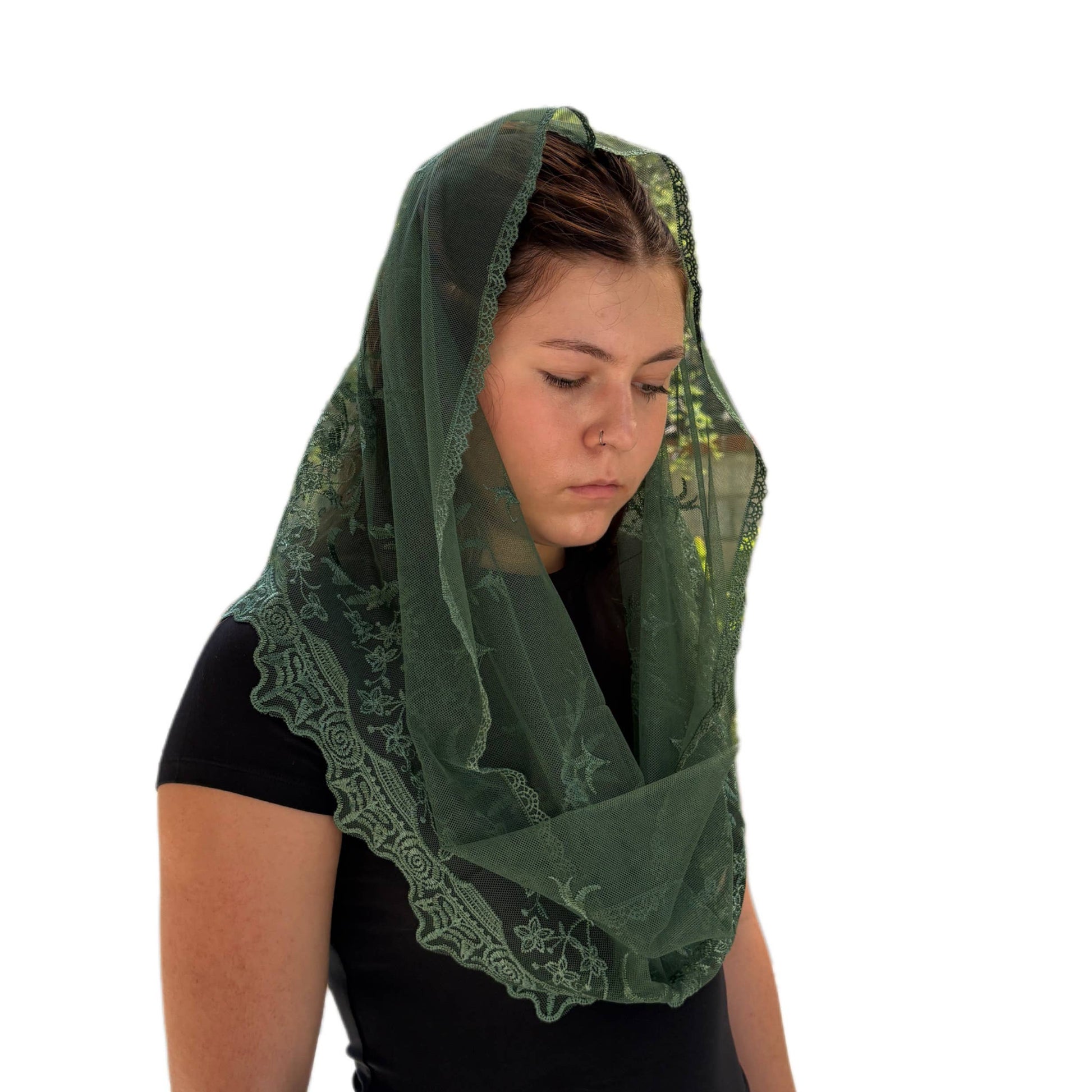 INFINITY VEIL is one of our most popular Church Veils, made with soft GREEN material thread embroidering and same color lace around the edge on one side of it.