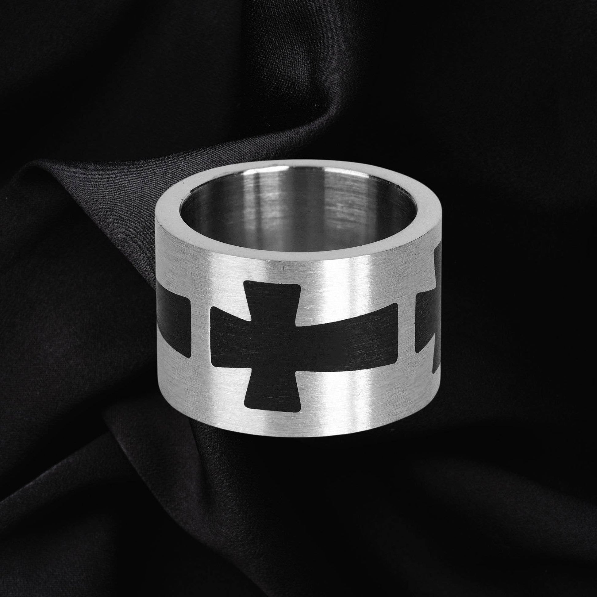 The thick round stainless steel band has a brushed finish and repeated black flare cross design. About 2mm thick all around; 9/16" wide. Comes on a header card with the words Men's Stainless Steel Rings. This ring is size 9.