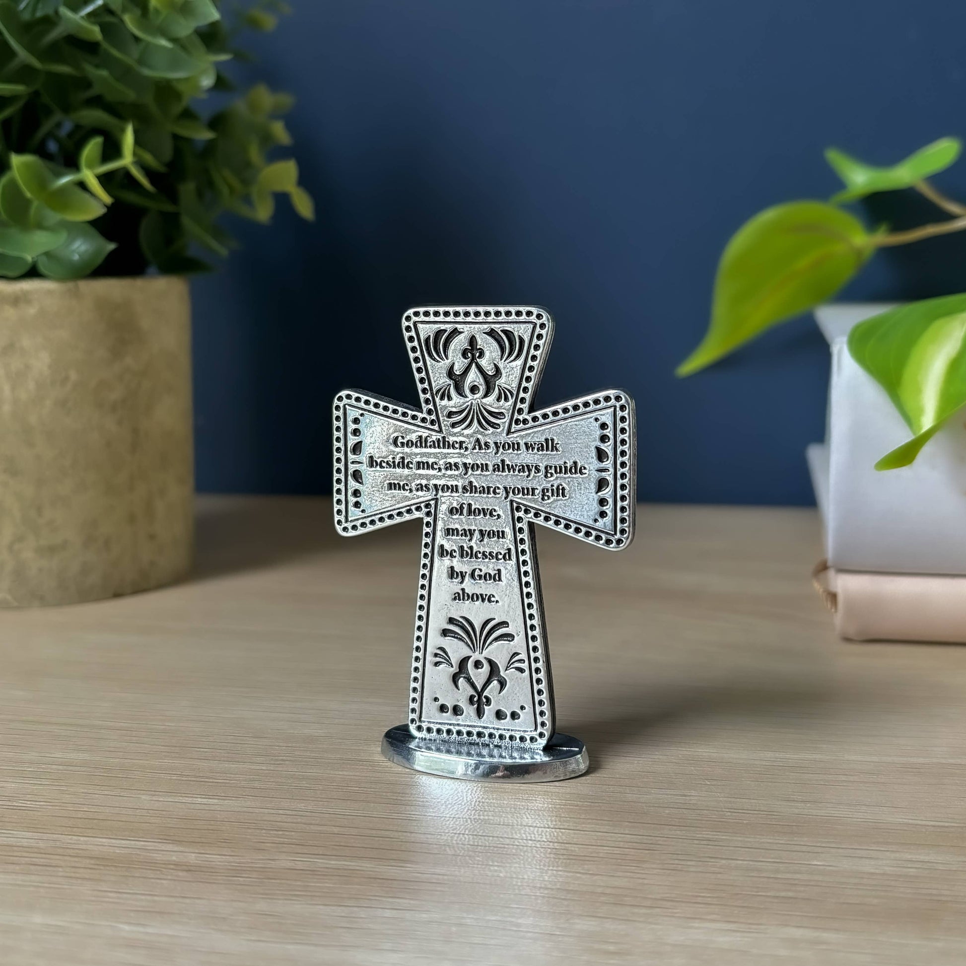 Show appreciation for Godfathers with a special gift to recognize their guidance and love. Standing message cross crafted of cast metal in bright, hand polished finish. Featuring blessing for Godfathers. 3” tall. Gift boxed.