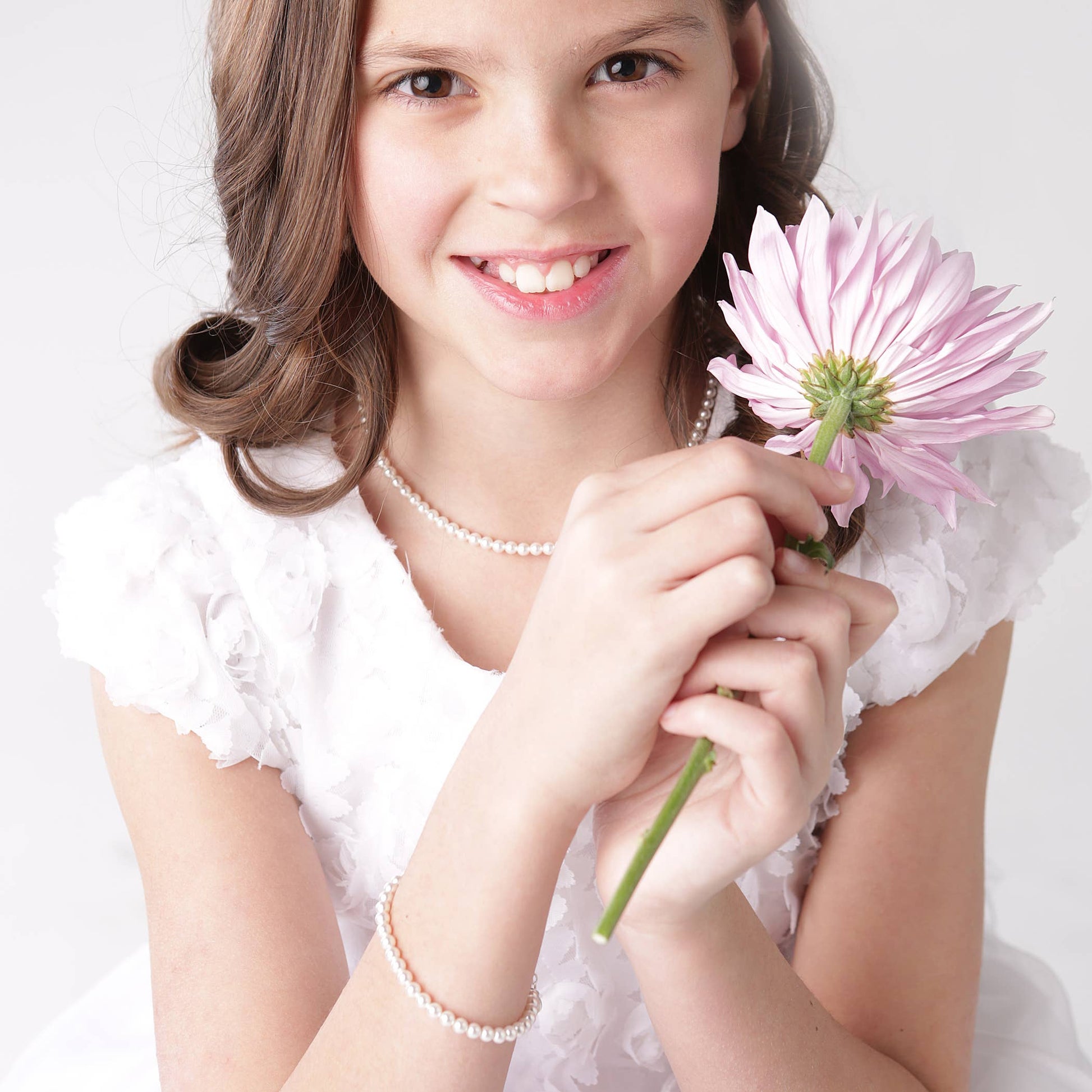 Her first Pearls! Simply beautiful sterling silver bracelet featuring a strand of gorgeous high-end simulated pearls. This looks beautiful for flower girls or Jr. Bridesmaid and is a timeless keepsake that makes a perfect baby gift, flower girl gift, or her first pearls! Each bracelet has an extension chain, so as the child grows you just move to the next link for a perfect fit. This bracelet is available in three sizes and is great for infants, babies, toddlers, and kids.