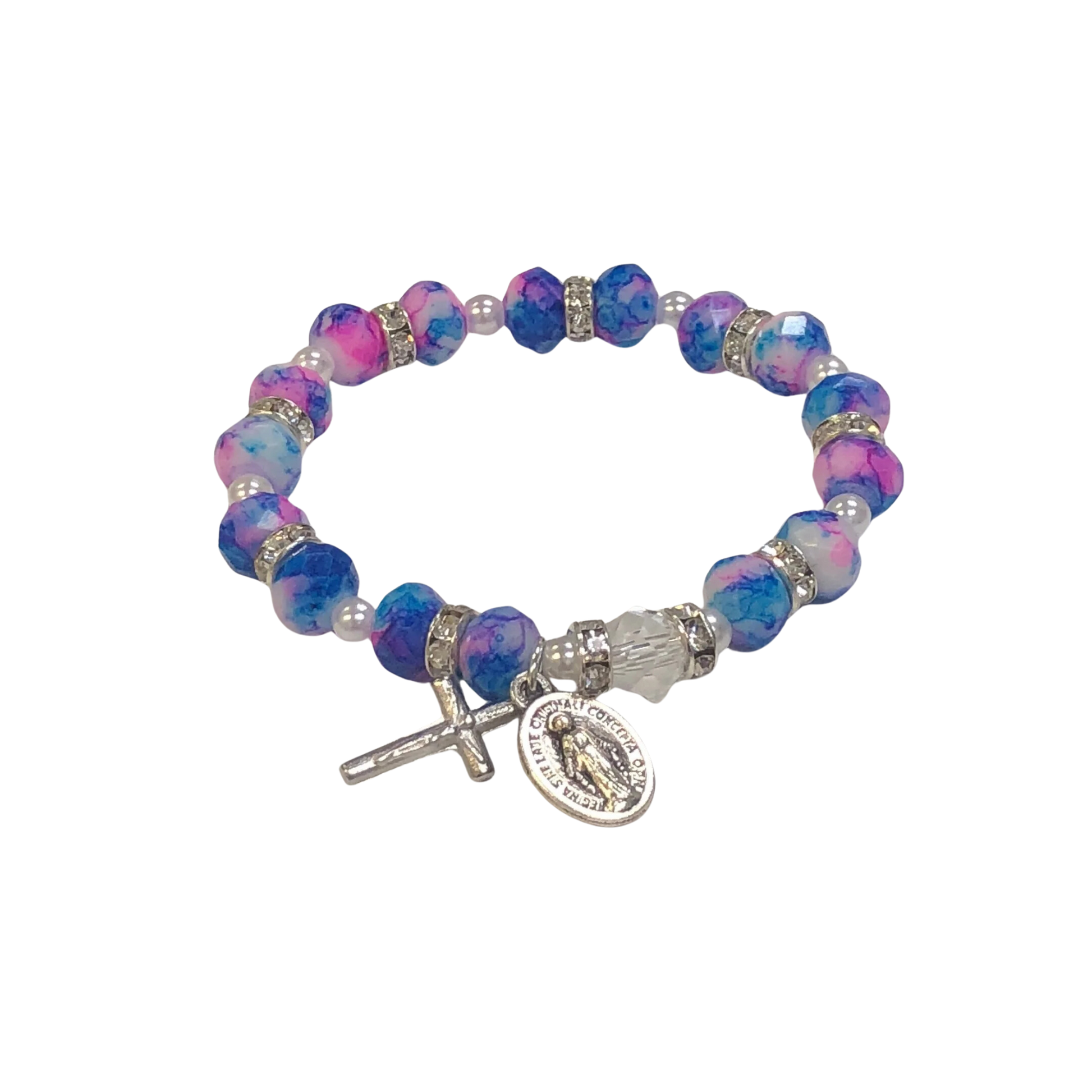 Cotton Candy Color Glass Stretch Bracelet with Miraculous Medal and Cross. Designed to fit children; tested and lead free!