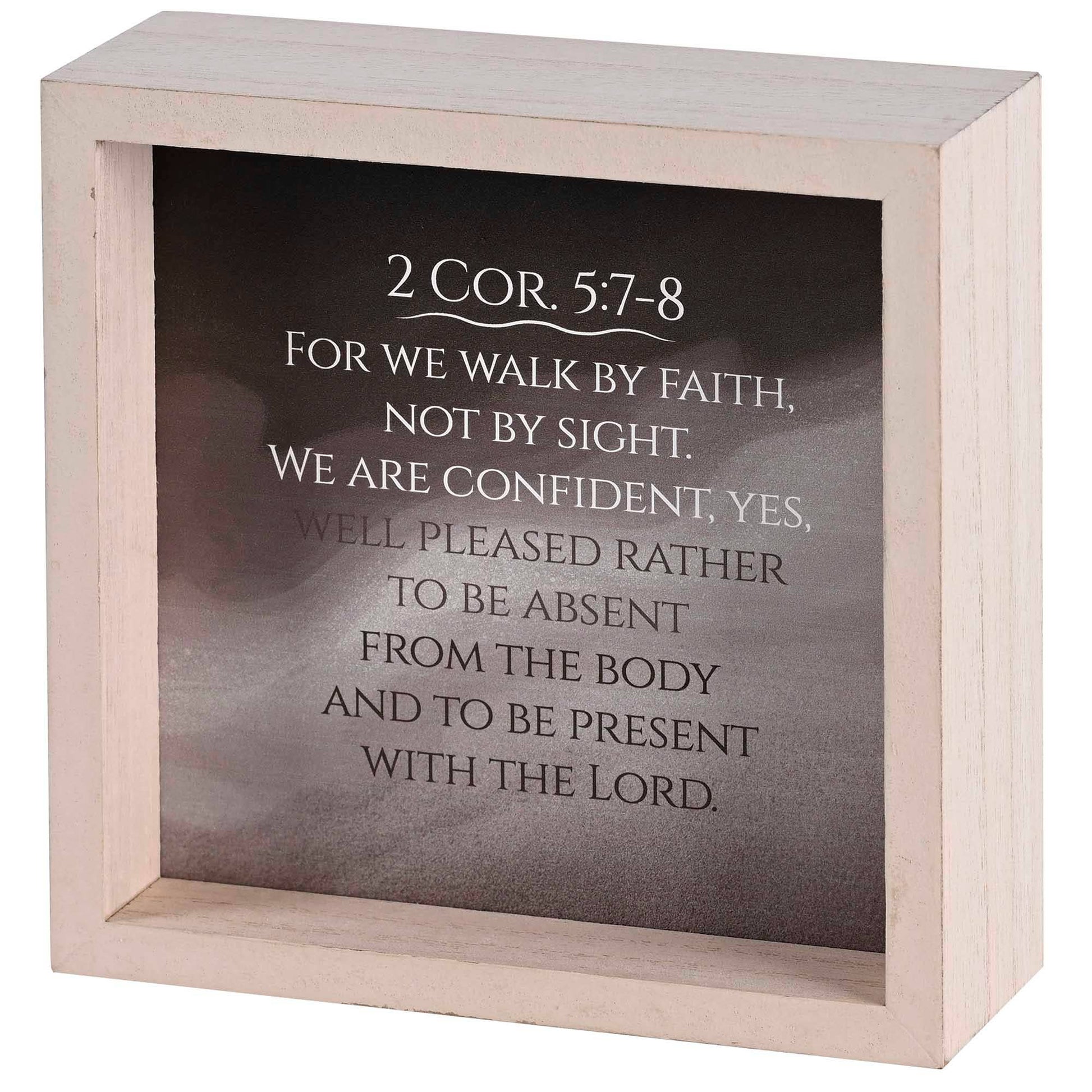 A Tabletop Art Piece Showcasing On One Side, A Word Study On 2 Corinthians 5:7: For We Walk (Live Life, Christian Walk, Conduct Ourselves, Daily Journey, Regulate Our Lives) By Faith (Following Gods Promises, In His Guidance, Put Your Complete Trust In Him, Defining Beliefs, With Trust And Holy Fervor), Not By Sight (Not On Your Own Understanding, Not By Past Experience, Not By Appearance, Fixing Your Eyes On The Eternal). The Other Side Displays 2 Corinthians 5:7-8: For We Walk By Faith, Not By Sight. We Are Confident, Yes, Well Pleased Rather To Be Absent From The Body And To Be Present With The Lord.