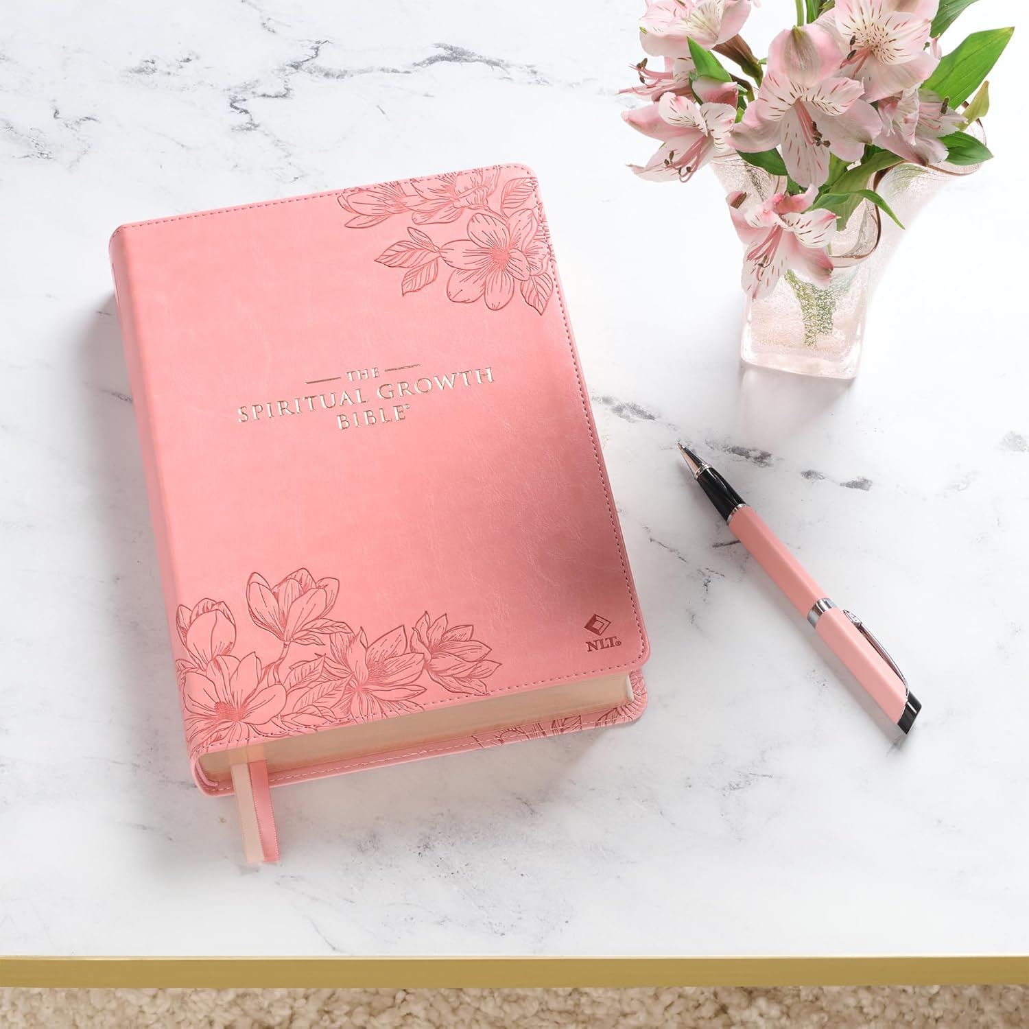 The spine of the pink faux leather Bible is embellished with a heat-debossed outlined creeping clematis design. Light pink accents are added to the petals to create dimension and depth in the design. The title is presented in clear gold-foiled letters.