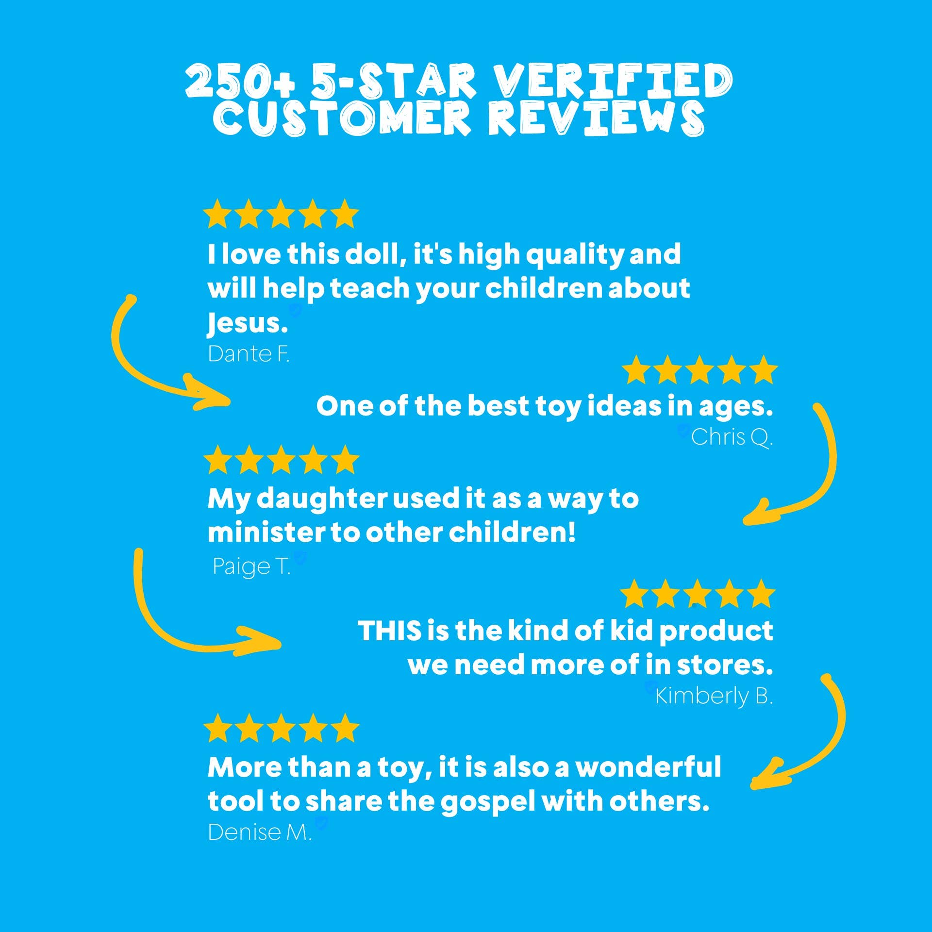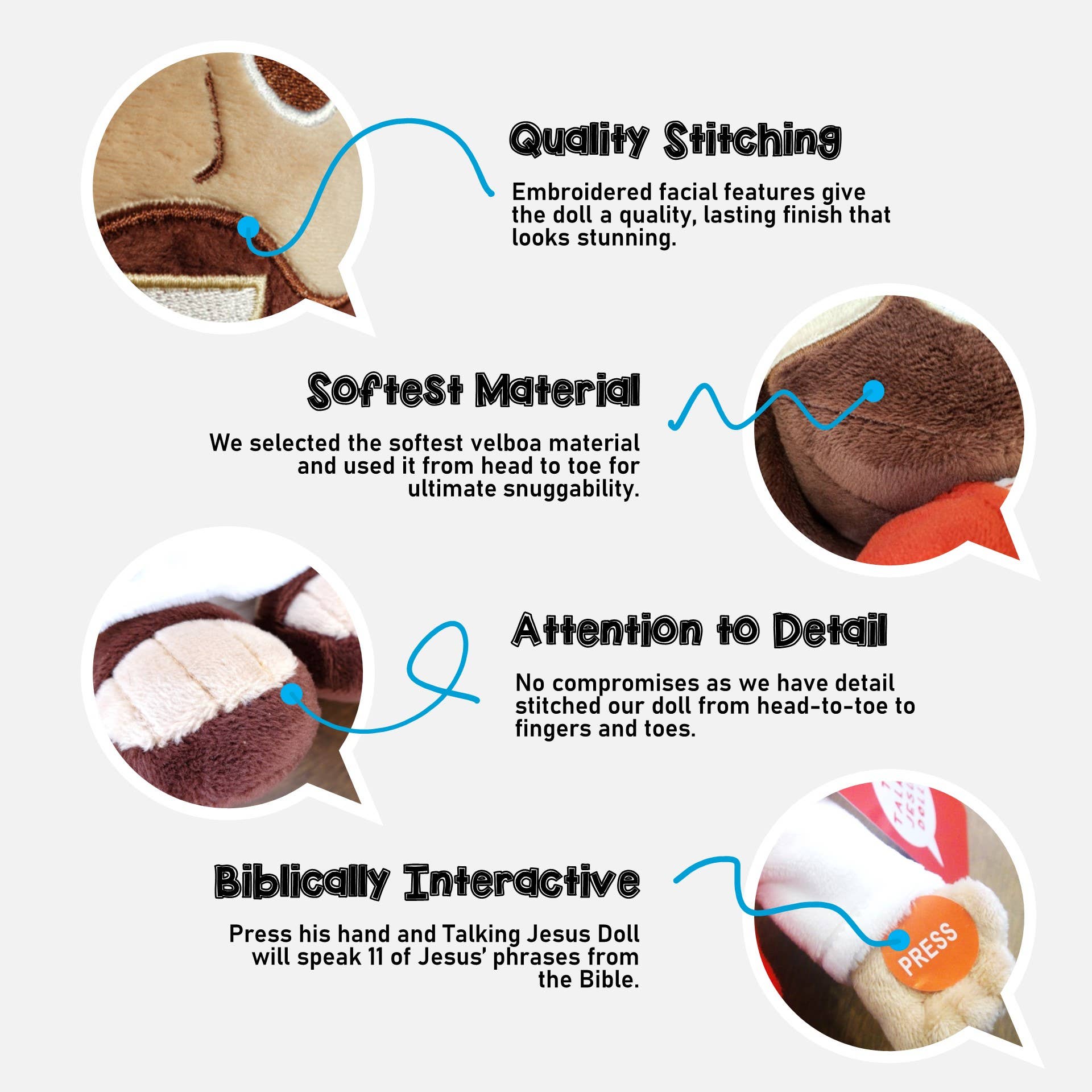 The Talking Jesus Doll is a beautiful 12" plush Jesus that speaks 10 phrases that Jesus said from the Bible. Jesus welcomes children with his outstretched arms, warm smile and a super-soft body. Children LOVE to squeeze his hand to make him talk. Parents and grandparents LOVE that their little ones are learning Jesus' important teachings from the Bible. Perfect for Christmas or for Christian Easter baskets. Teach your kids before the World does.