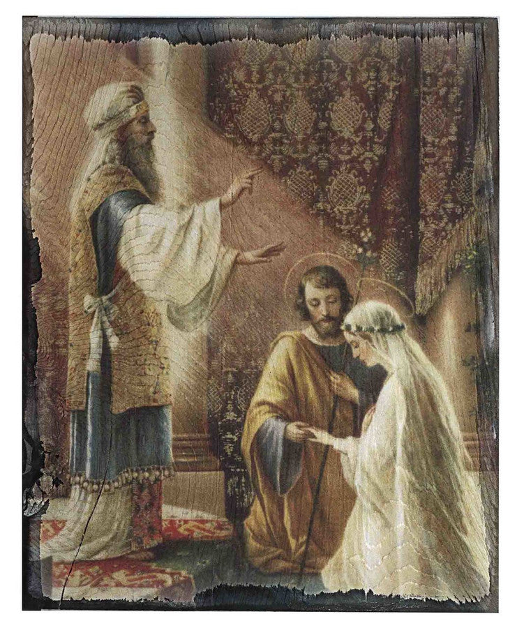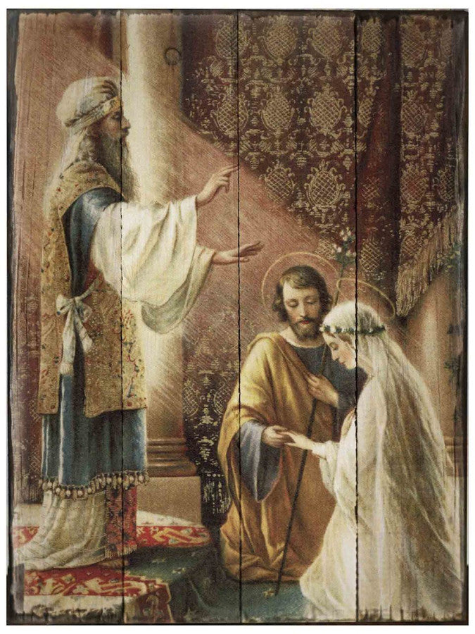 This rustic wood plaque features the Wedding of Joseph and Mary.