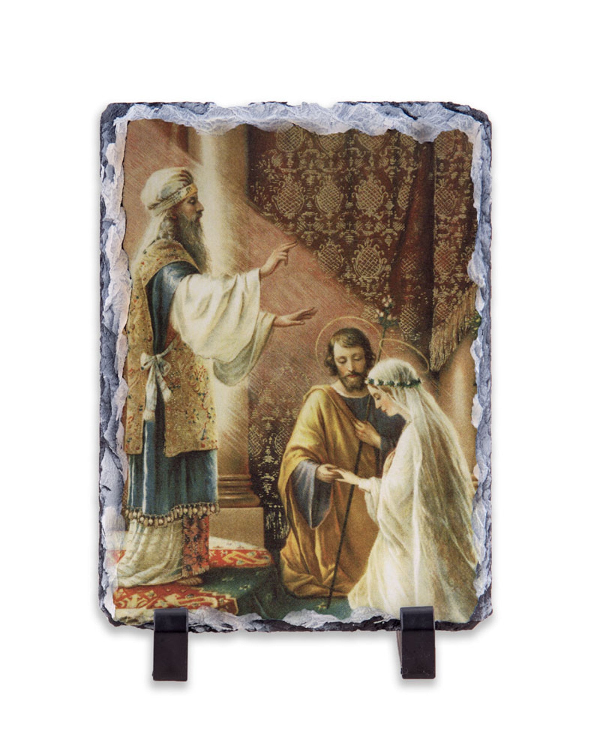 This Wedding of Joseph and Mary vertical slate tile comes with two black easel "feet" to allow the tile to stand upright on a desk, shelf, or table. No two slate tiles are 100% alike.