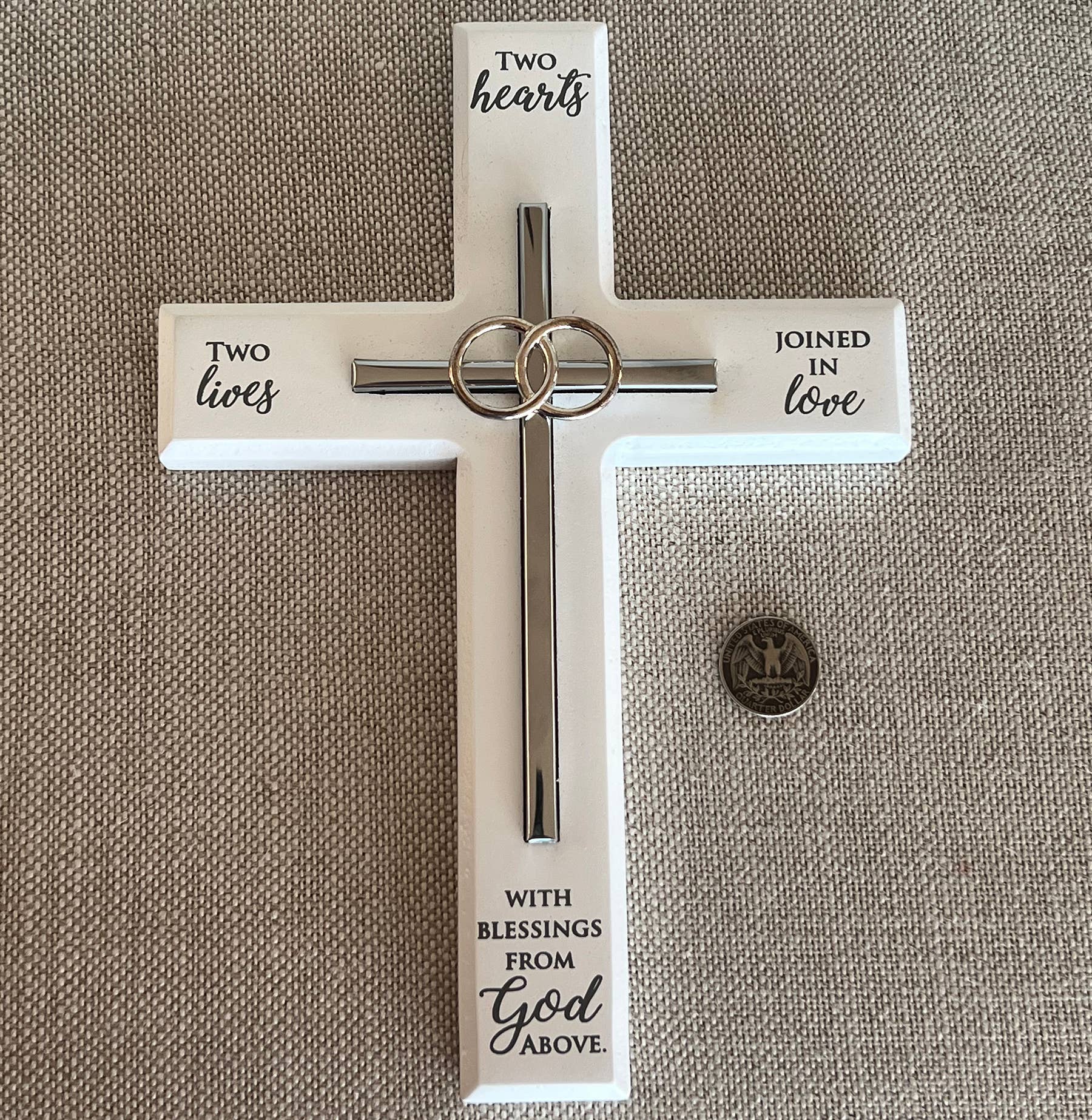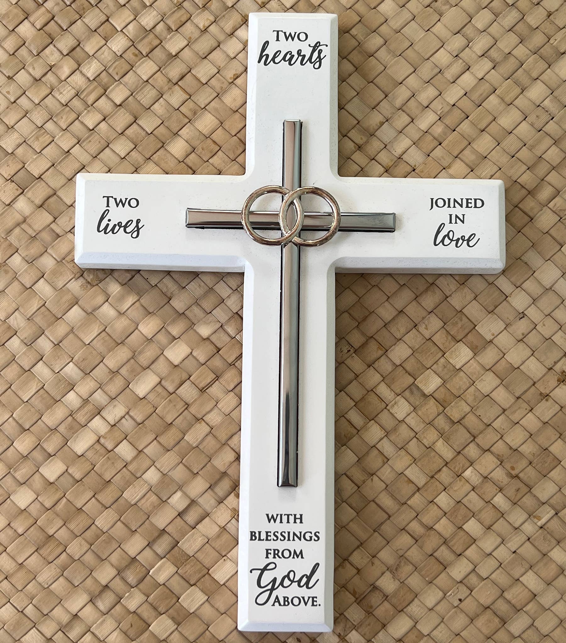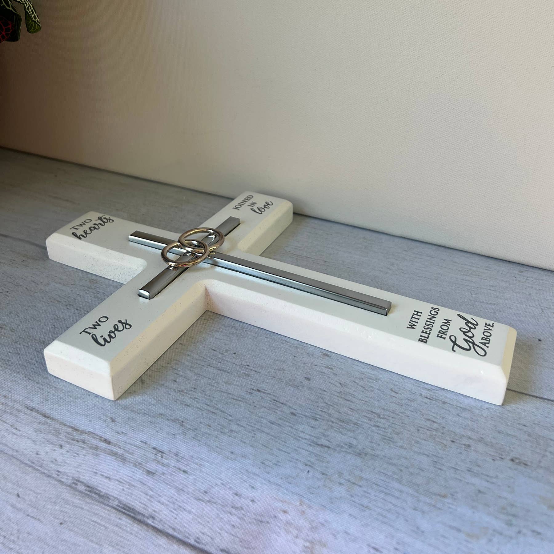 Wedding wall cross made of MDF in white finish with metal cross and intertwined rings. 7" x 10". Boxed.