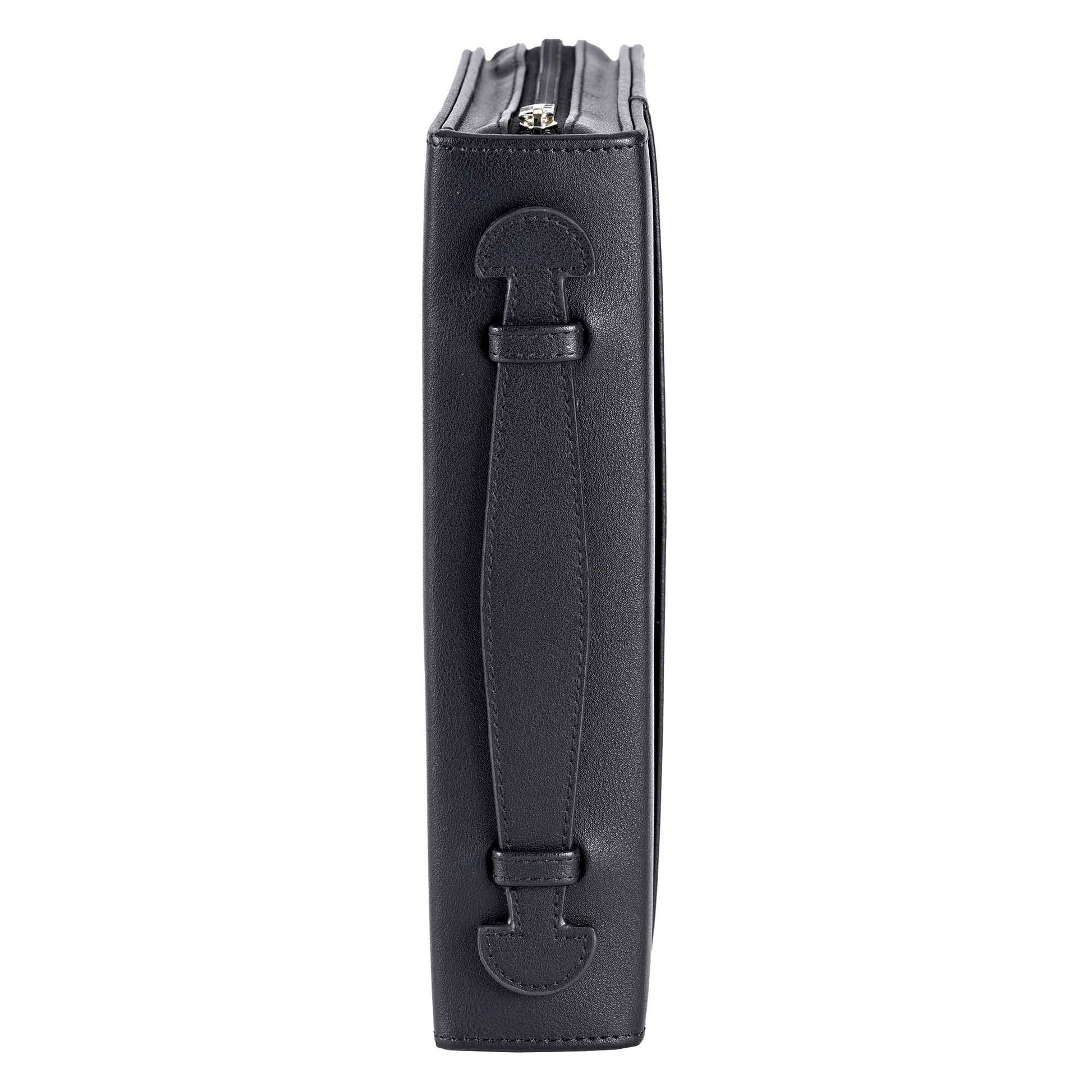 Hard shell style polyurethane Bible cover. Solid black color handbag material. Inside is a bookmark & elastic pen loop with cut thru Cross zipper pull; side handle, non-rusting self-repairing zipper, nylon reinforced stitching, White Dove design.