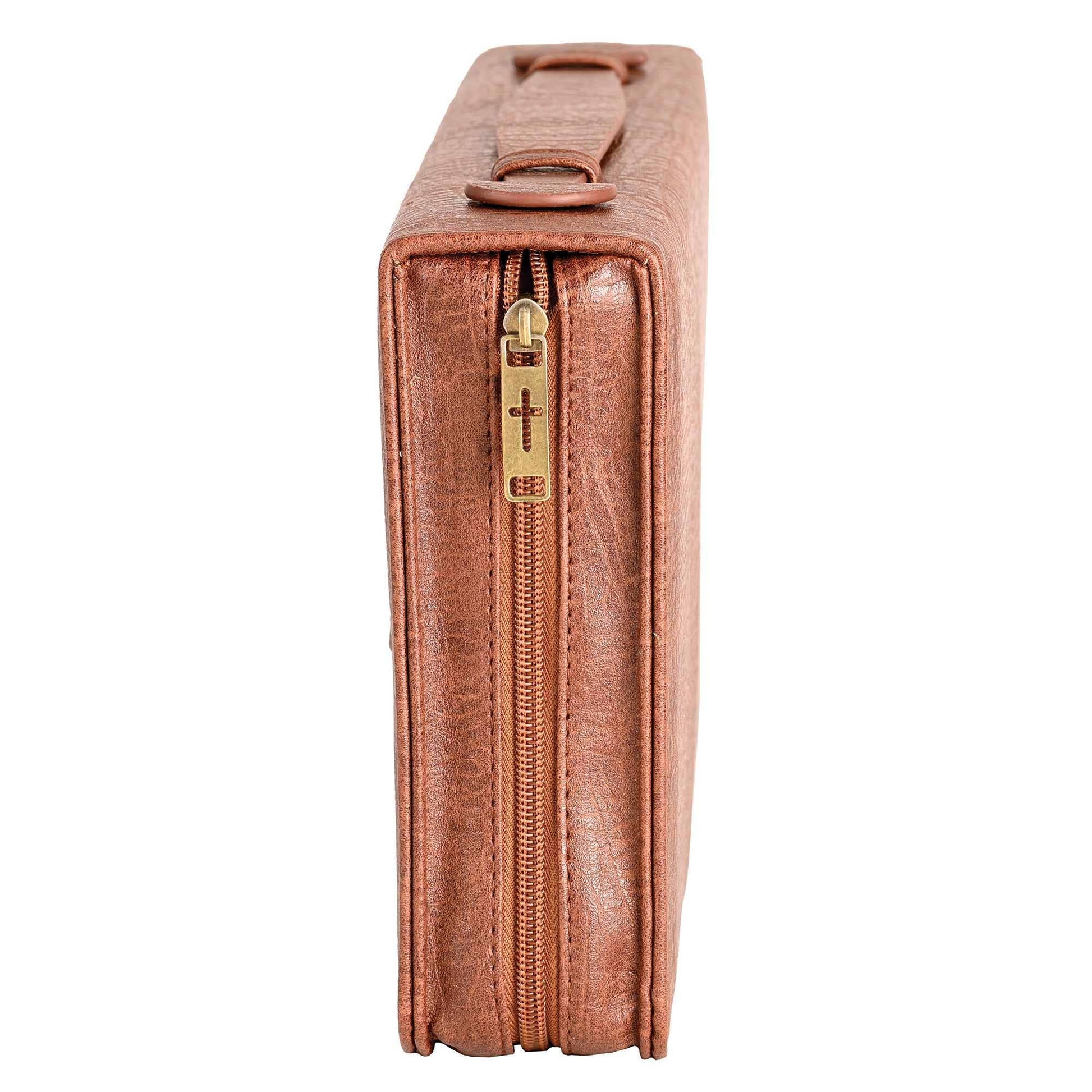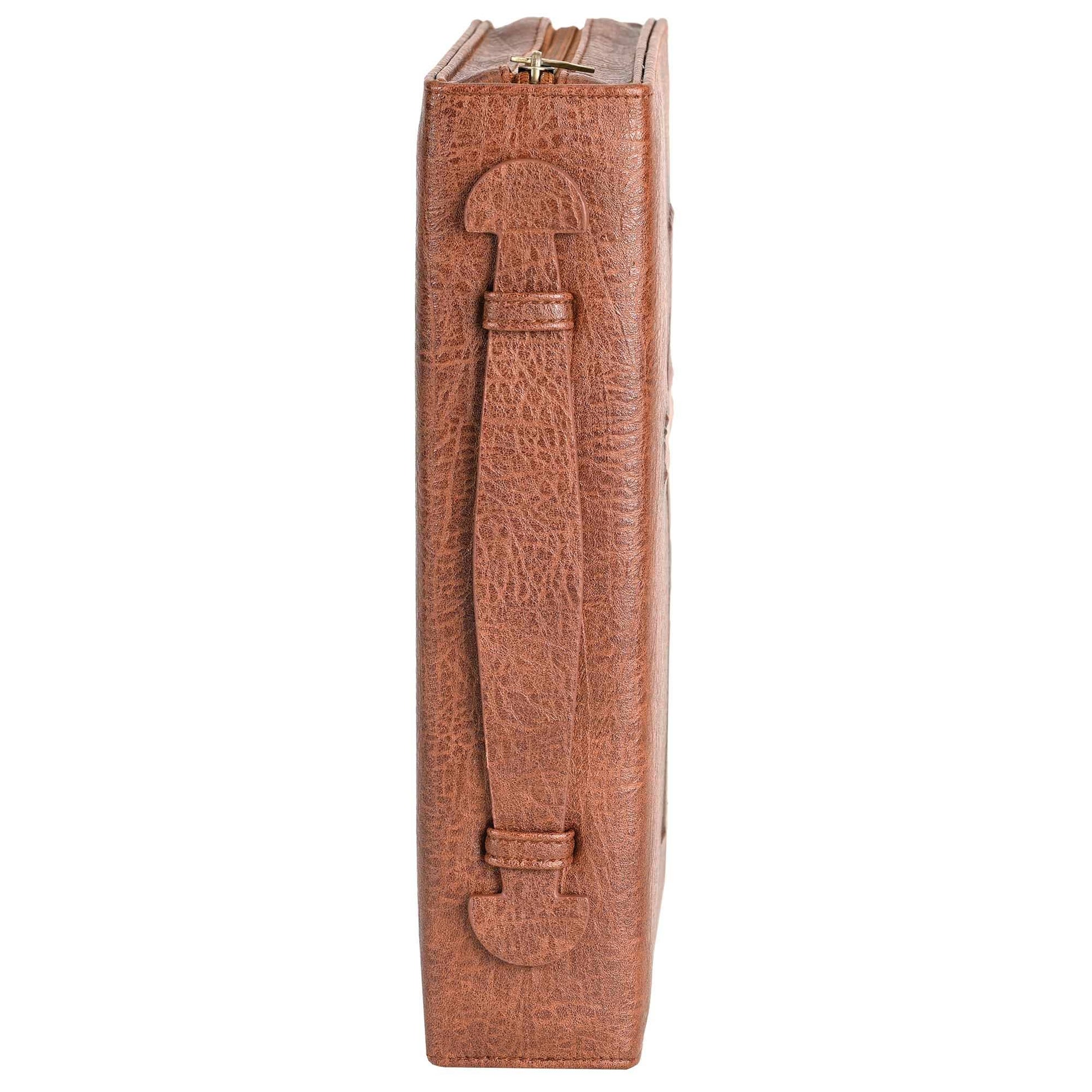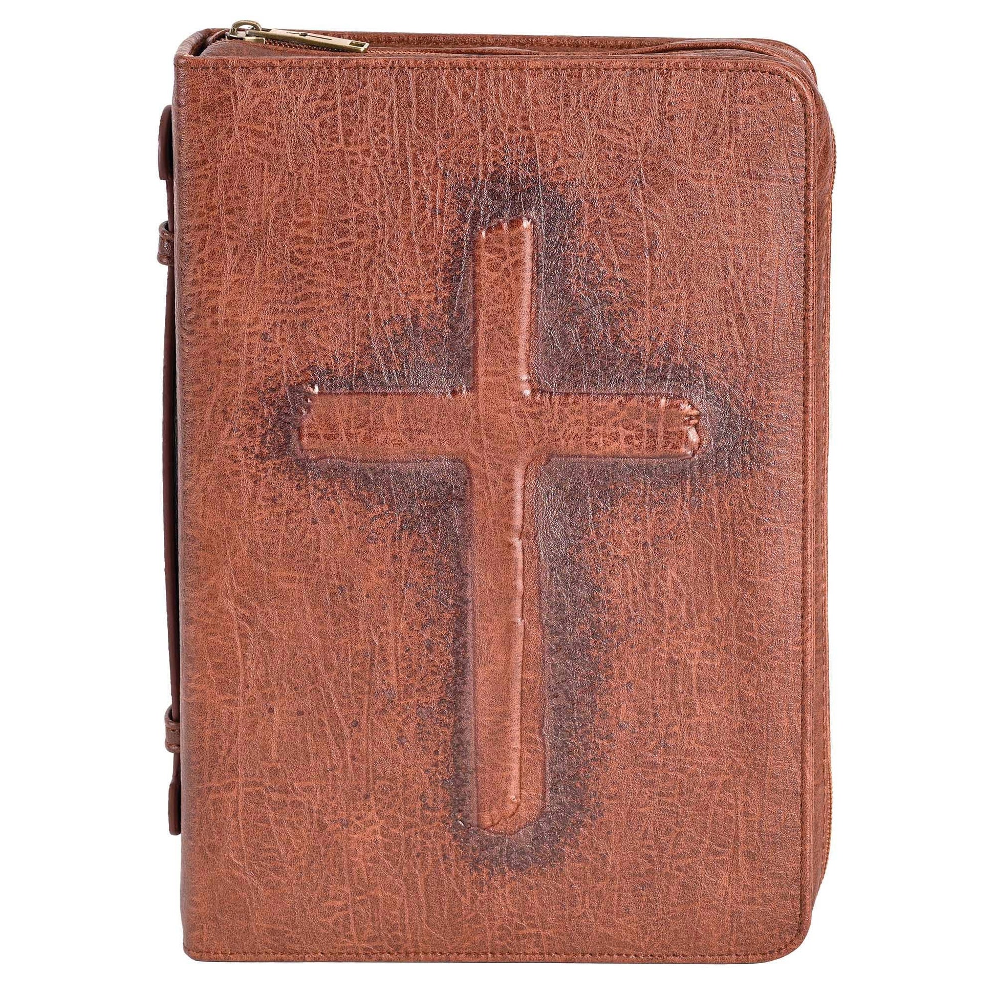 HARD SHELL STYLE- PU Bible cover -inside book mark & elastic pen loop; color brown, size XL; vintage/embossed cross on cover. White Dove design.