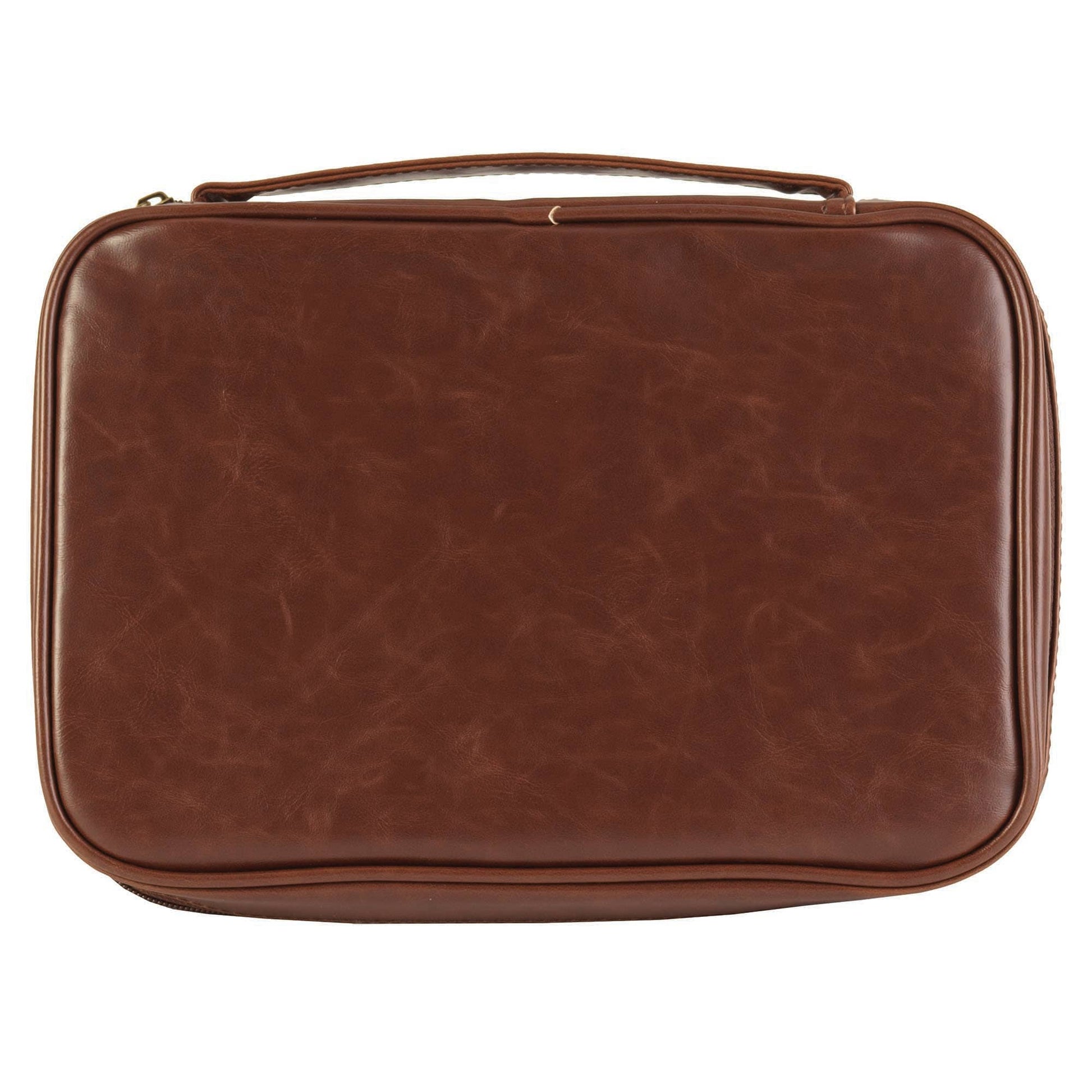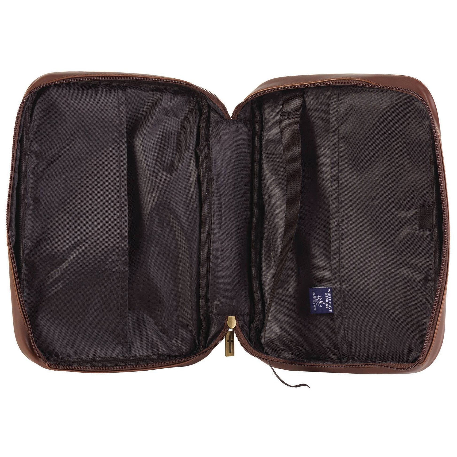 This durable Bible cover looks and feels like finely textured leather! It's actually a soft polyurethane vinyl. Roomy zippered storage pocket on front; silver metal zipper pull has indented black cross. Has a non-rusting, self repairing zipper; nylon reinforced stitching; carrying handle on spine; attached ribbon bookmark and pen loop inside. Available in two colors and three sizes. Inner size dimensions: Large is 9 1/4 x 6 1/4 x 1 1/4 inches. White Dove design.