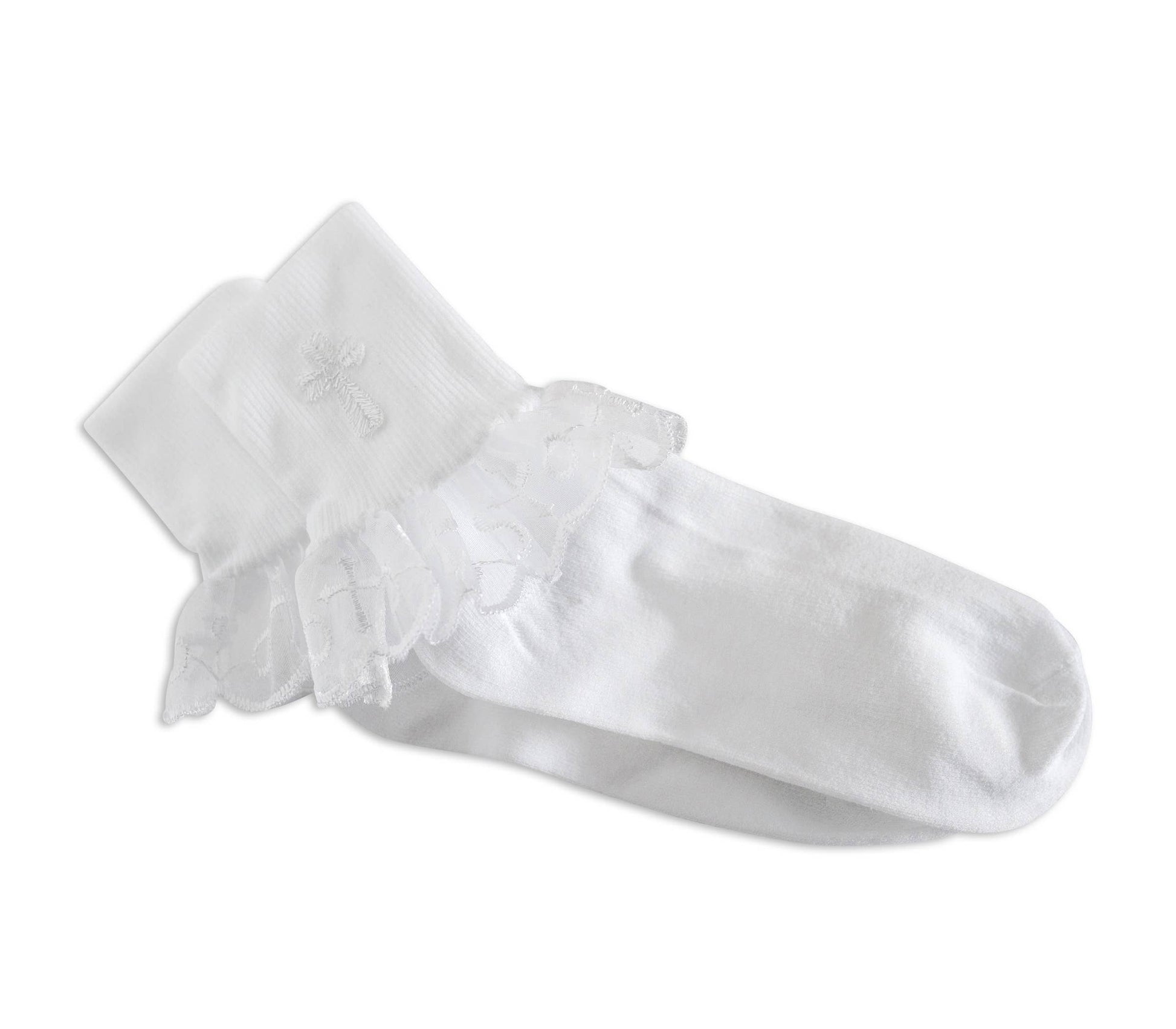 Girls white socks with beautiful lace with cross embellishments and accented with an embroidered cross. These are beautiful socks perfect for First Communion or church socks.