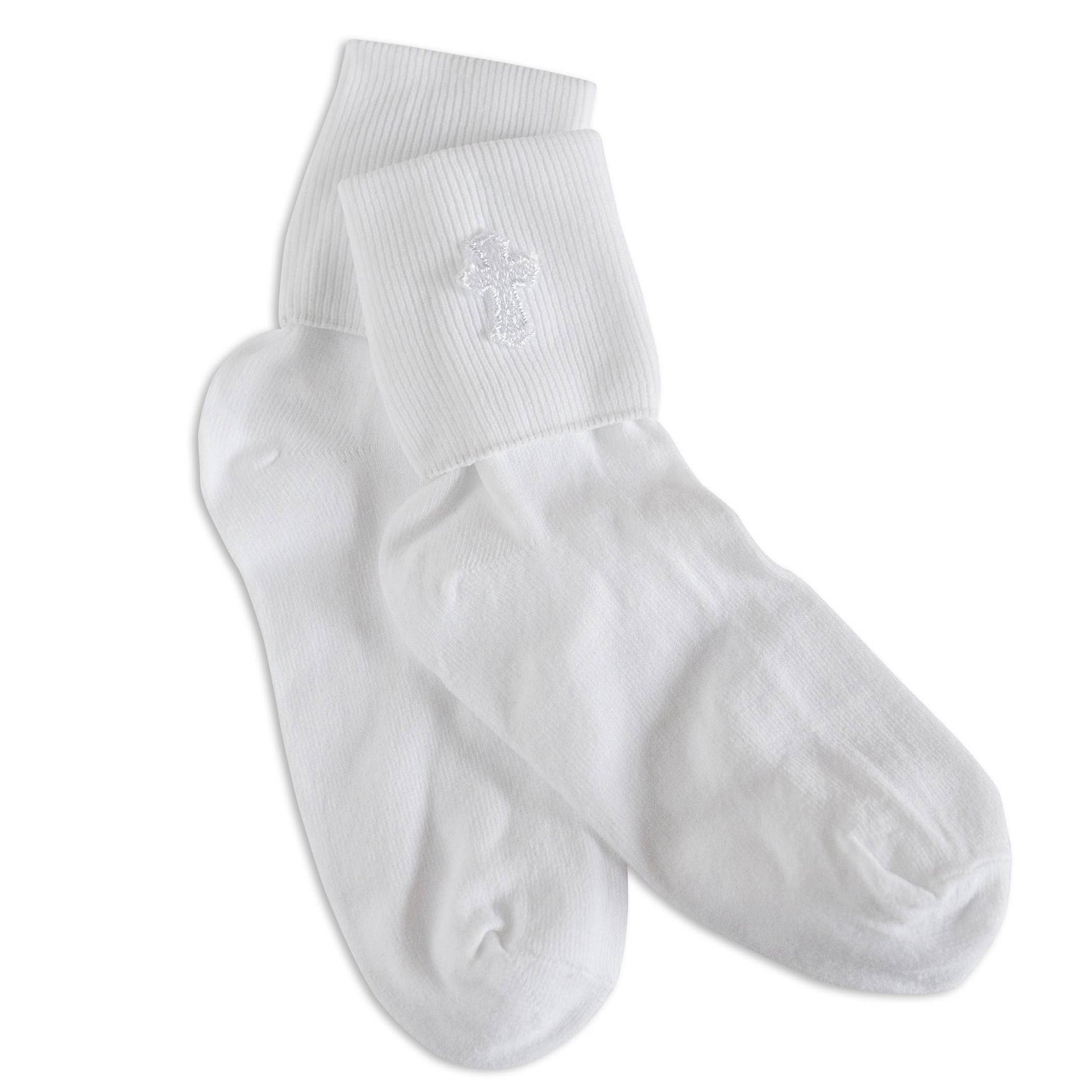 White unisex cuff dress socks with embroidered cross embellishment. These are beautiful socks perfect for First Communion or church socks.